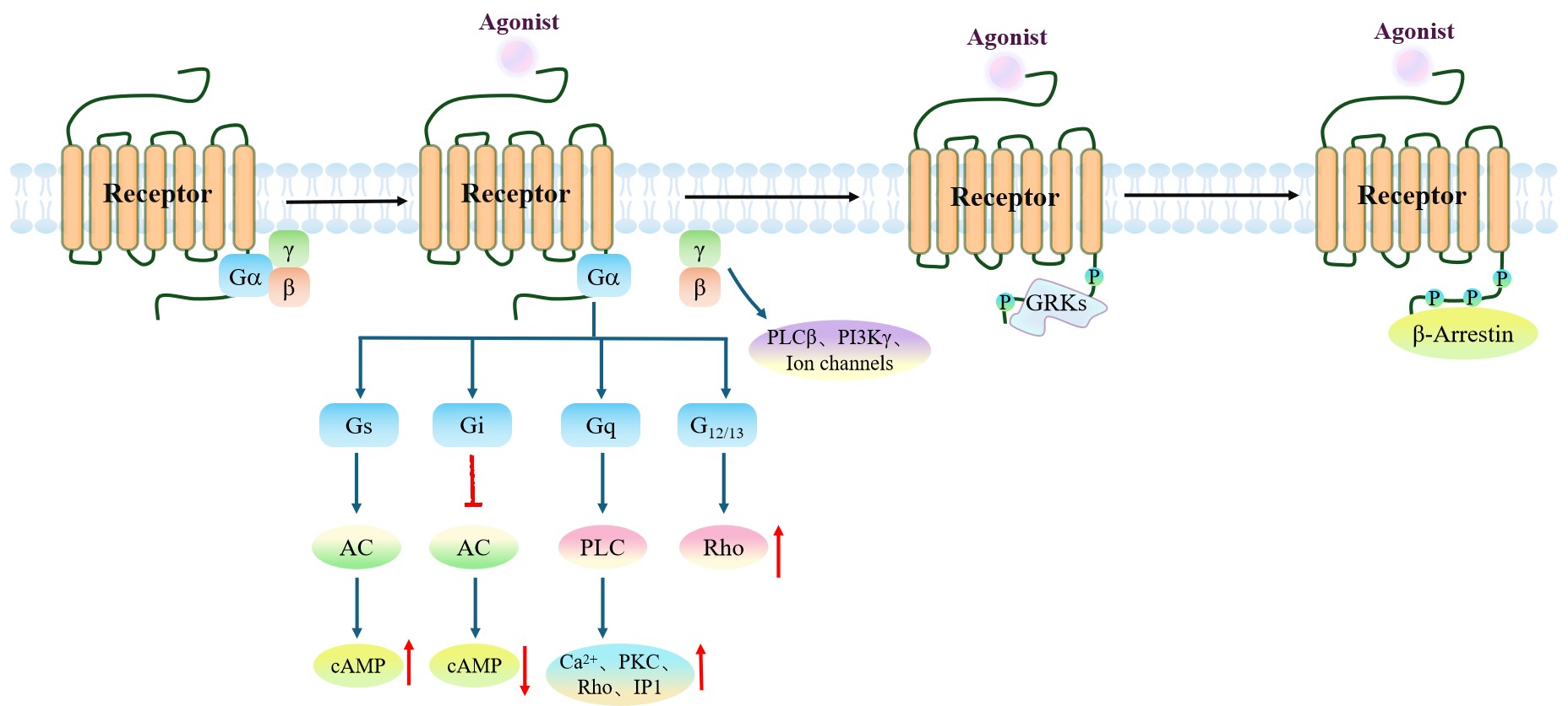 人類GPCR家族根據(jù)其氨基酸序列分為A類(視紫紅質(zhì))、B類(分泌素和粘附)、 C類(谷氨酸鹽)和F類(Frizzled)亞家族。A類GPCRs是由719個(gè)成員組成的視紫紅質(zhì)樣受體家族,分為幾個(gè)亞類:胺類、肽類、蛋白質(zhì)類、脂質(zhì)類、褪黑素類、核苷酸類、類固醇類、糖羧酸類、感覺類和孤兒類。A類GPCRs的適應(yīng)癥包括止痛藥、過敏、心血管疾病、高血壓、癌癥等。