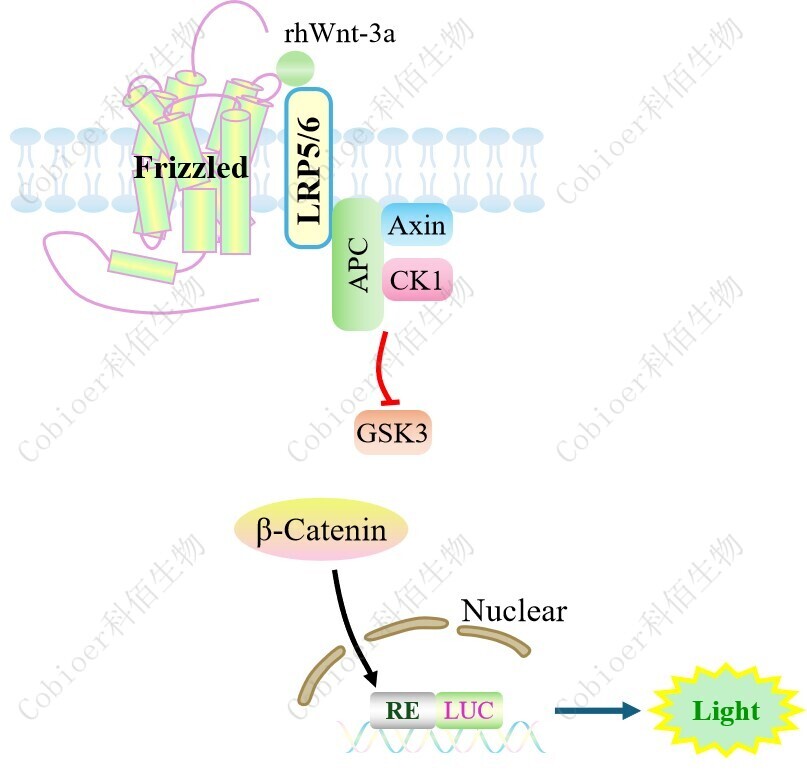 Wnt Effector Reporter Cell 報(bào)告基因藥靶模型很好的模擬了體內(nèi) WNT 的信號(hào)轉(zhuǎn)導(dǎo)過程,原理見下圖所示。