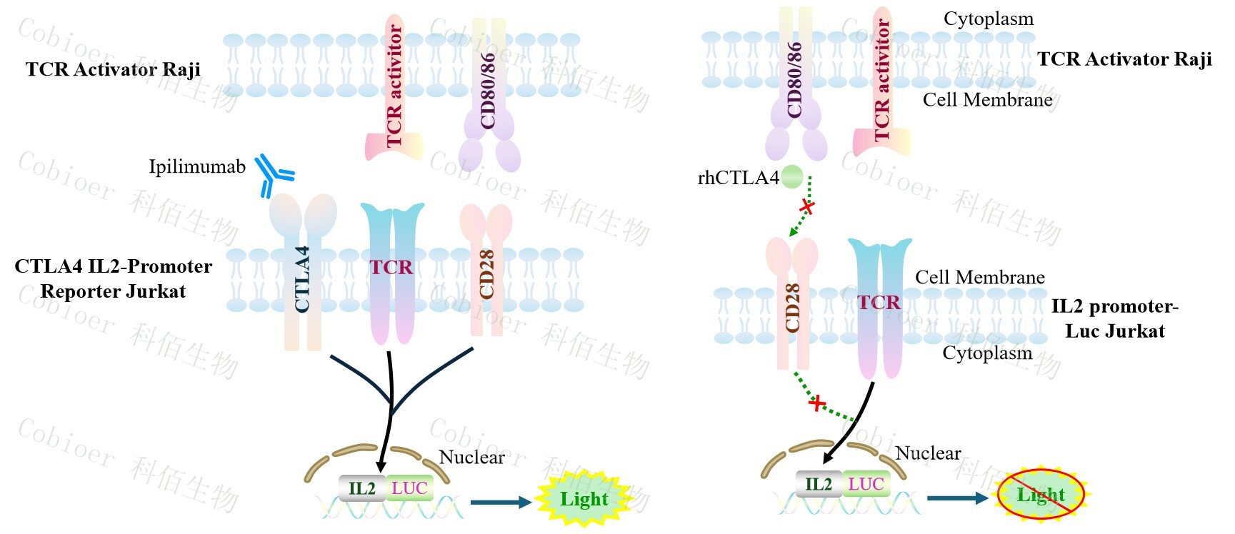 TCR Activator Raji 報(bào)告基因藥靶模型很好的模擬了體內(nèi) CD28&CD80/CD86 或者CTLA4 的信號(hào)轉(zhuǎn)導(dǎo)過程,原理見下圖所示。![]() Figure 1. TCR Activator Raji 細(xì)胞模型原理圖 |