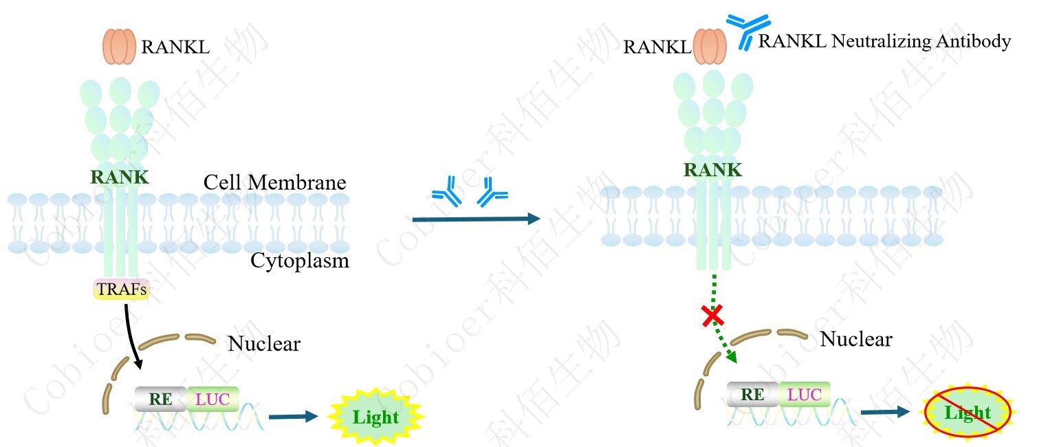 RANK Effector Reporter Cell 報(bào)告基因藥靶模型很好的模擬了體內(nèi) RANK 的信號轉(zhuǎn)導(dǎo)過程,原理見下圖所示。![]() Figure 1. RANK Effector Reporter Cell 細(xì)胞模型原理圖 |