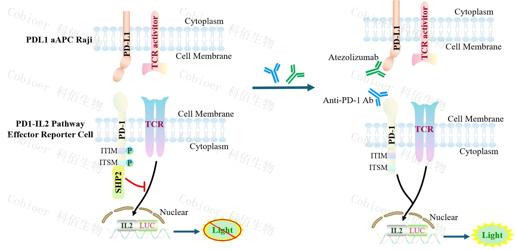 PD1-IL2 Pathway Effector Reporter Cell 報(bào)告基因藥靶模型很好的模擬了體內(nèi) PD1&IL2 的信號(hào)轉(zhuǎn)導(dǎo)過(guò)程,原理見(jiàn)下圖所示。![]() Figure 1. PD1-IL2 Pathway Effector Reporter Cell 細(xì)胞模型原理圖 |