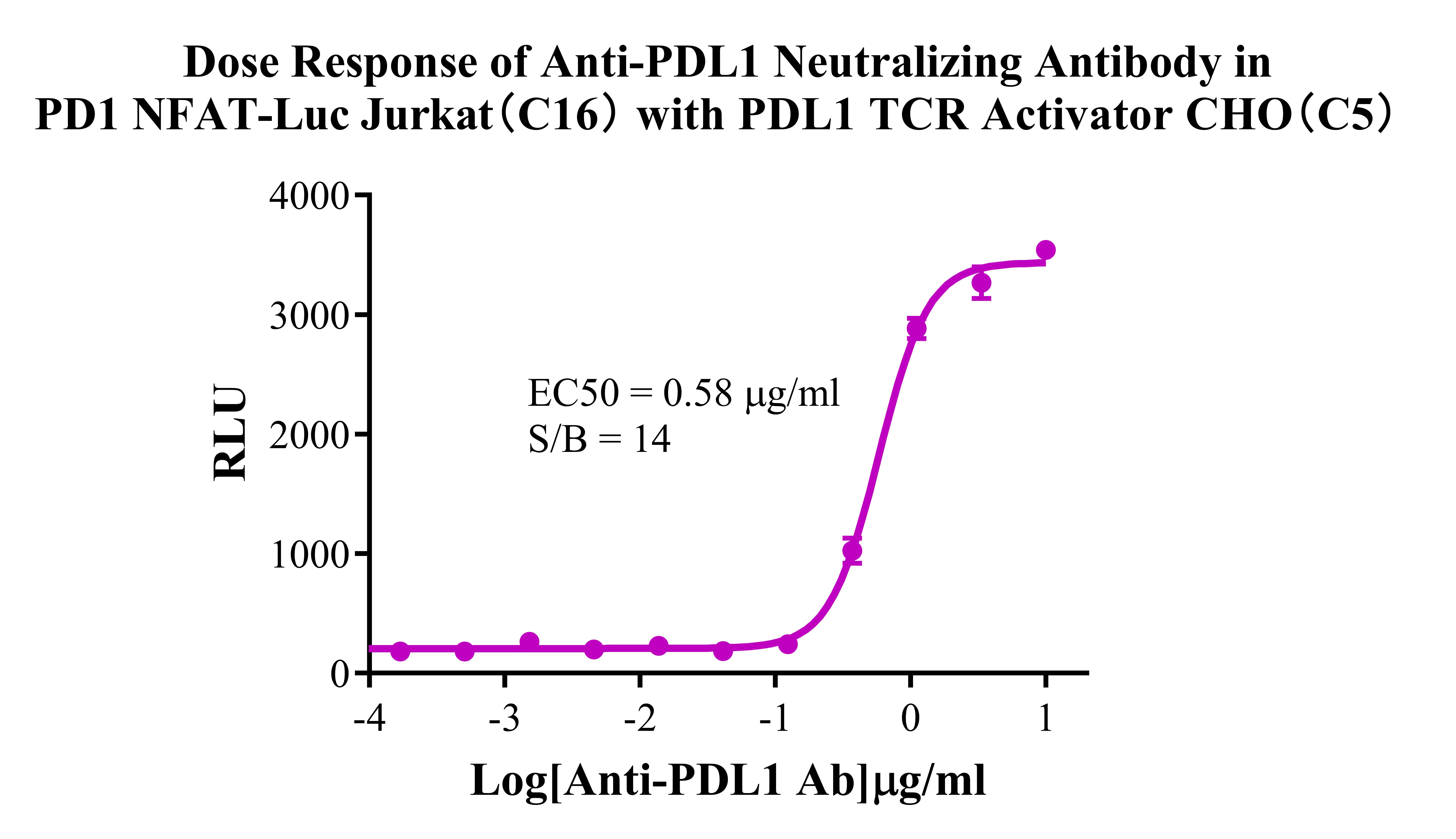 Figure 4. Detect Luciferase assay by Ultra Luciferase Detection Kit CBPH0001(we strongly suggest to purchase from Cobioer). Dose response of Anti-PDL1 Neutralizing Antibody in PD1 NFAT-Luc Jurkat(C16) with PDL1 TCR Activator CHO (C5). |