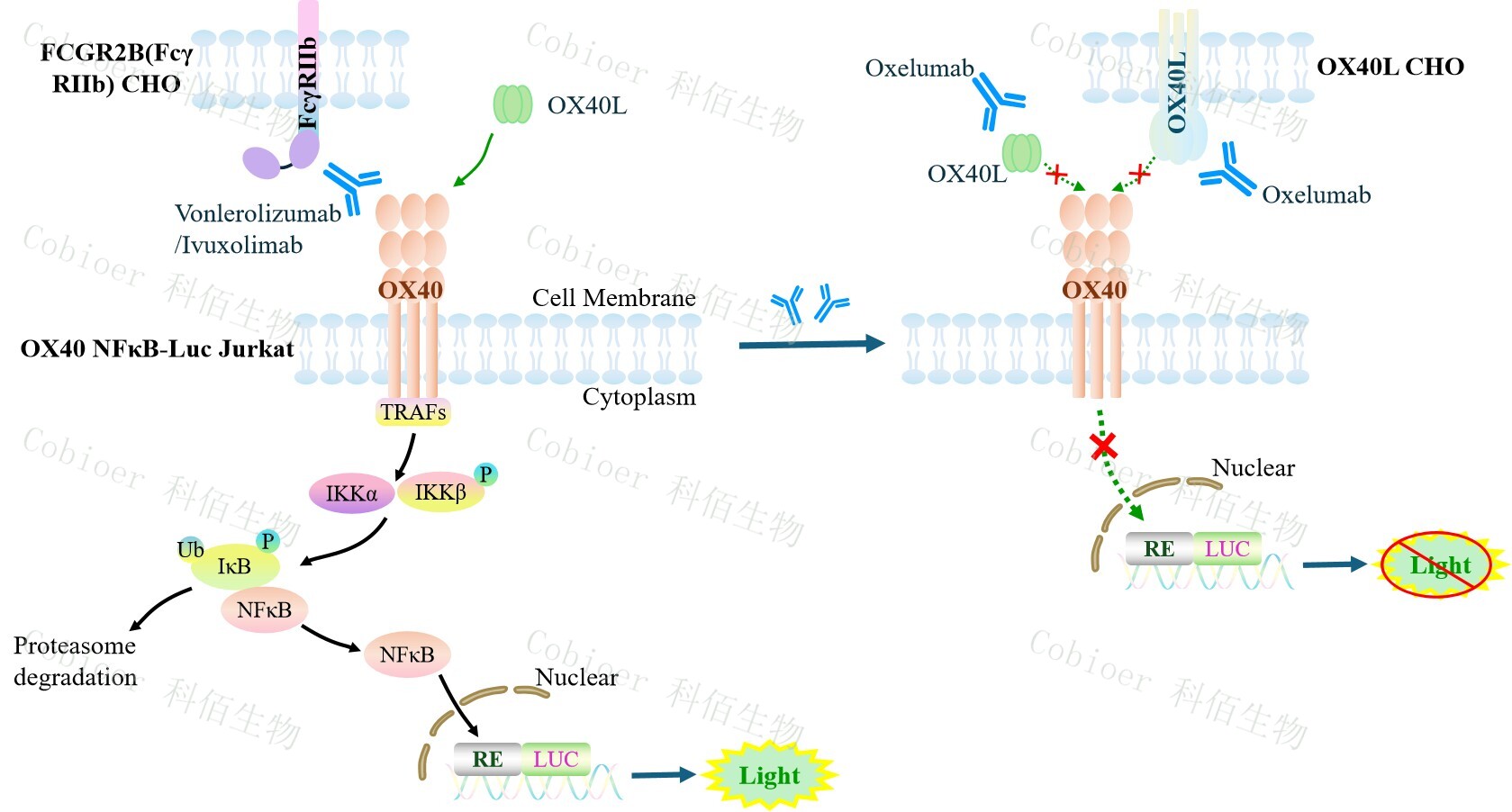 ![]() Figure 1. OX40 NFκB-Luc Jurkat 細胞模型原理圖