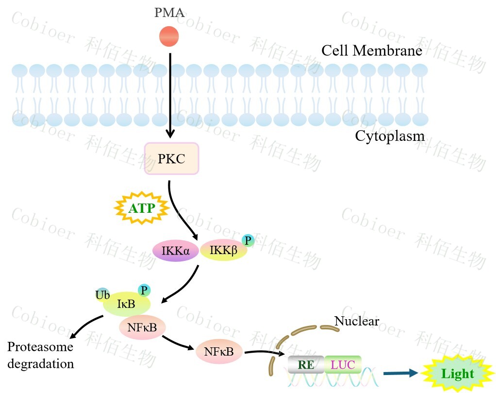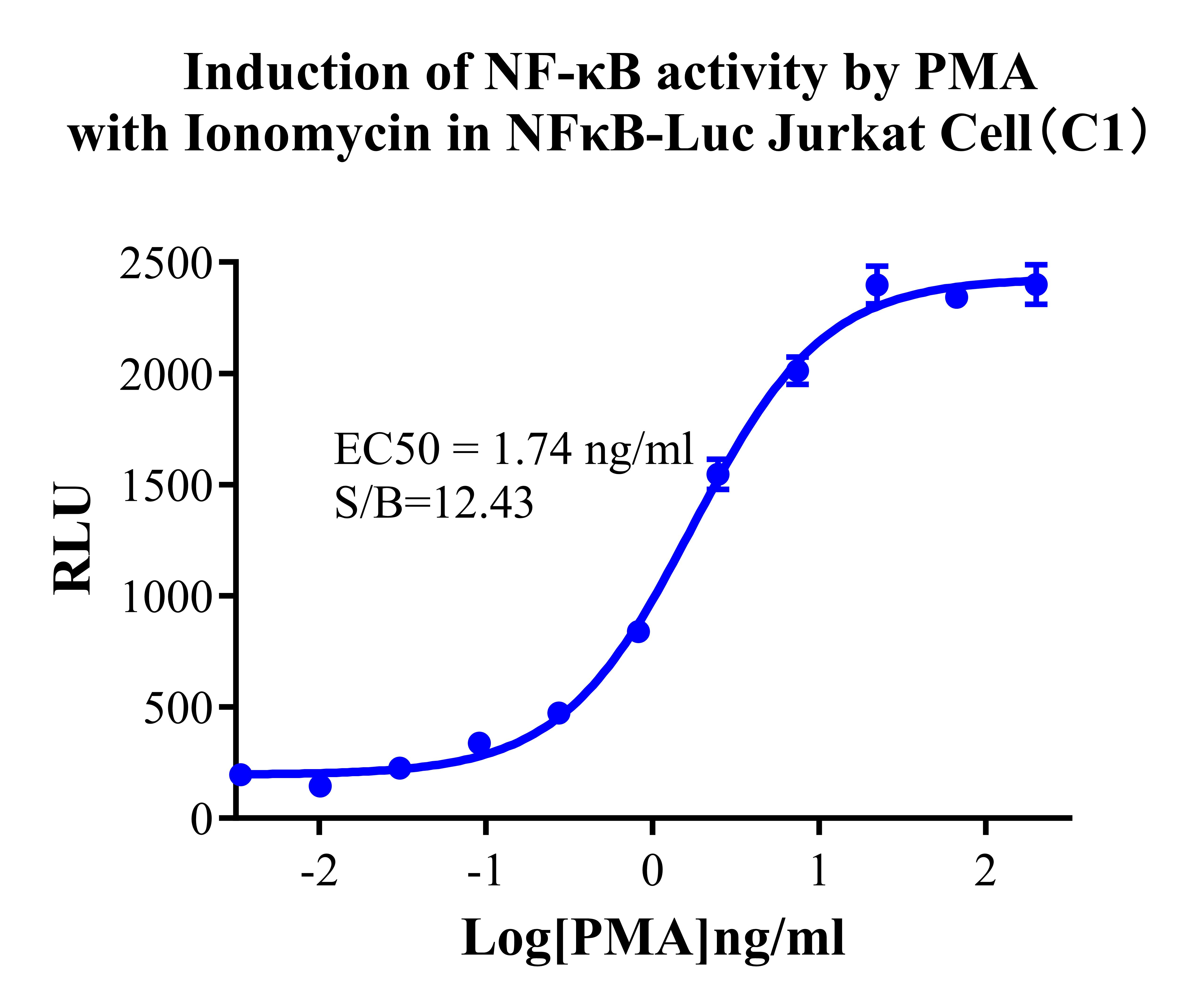 NFκB-Luc Jurkat 報告基因細胞是由 NFκB 調(diào)控并表達 Luc 熒光素酶報 告基因的 Jurkat細胞。PMA 是 DAG(二酯酰甘油)的類似物,可自由的通過細胞膜,直接 作用于細胞活化信號轉(zhuǎn)導通路上的 PKC,原理見下圖所示。![]() Figure 1. NFκB-Luc Jurkat 細胞模型原理圖