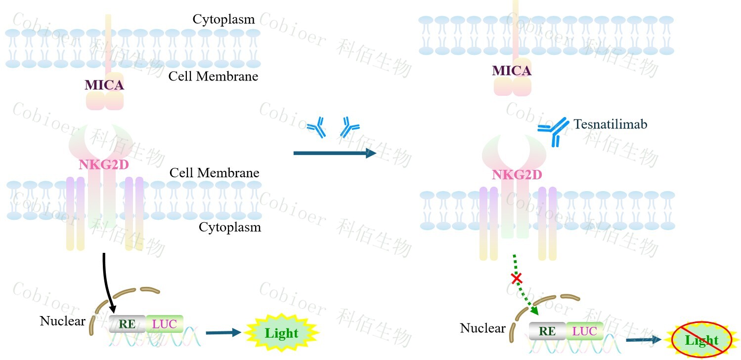 MICA CHO 作為 NKG2D Effector Reporter Cell 的靶細(xì)胞,很好的模擬了體內(nèi) NKG2D 的信號(hào)轉(zhuǎn)導(dǎo)過(guò)程,原理見(jiàn)下圖所示。![]() Figure 1. MICA CHO 細(xì)胞構(gòu)建原理圖 |