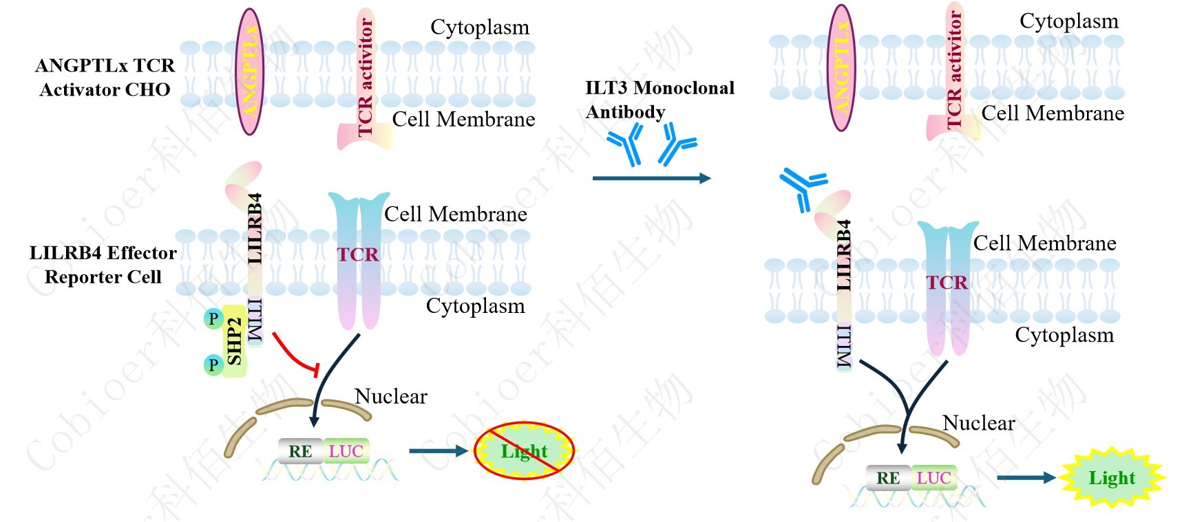 LILRB4 Effector Reporter Cell 報(bào)告基因藥靶模型很好的模擬了體內(nèi) LILRB4 的信號(hào)轉(zhuǎn) 導(dǎo)過(guò)程,原理見(jiàn)下圖所示。![]() ![]() Figure 1. LILRB4 Effector Reporter Cell 模型原理圖