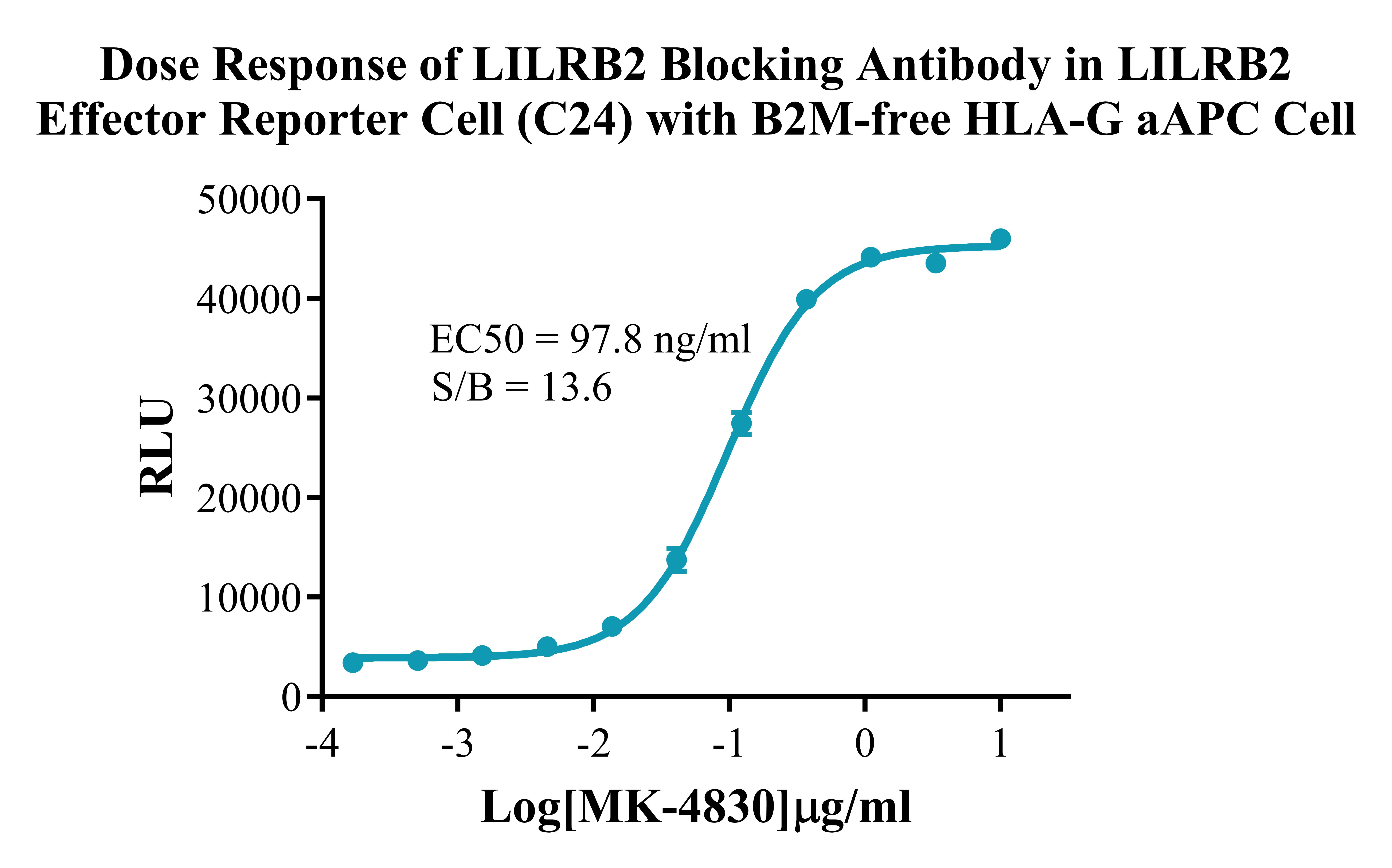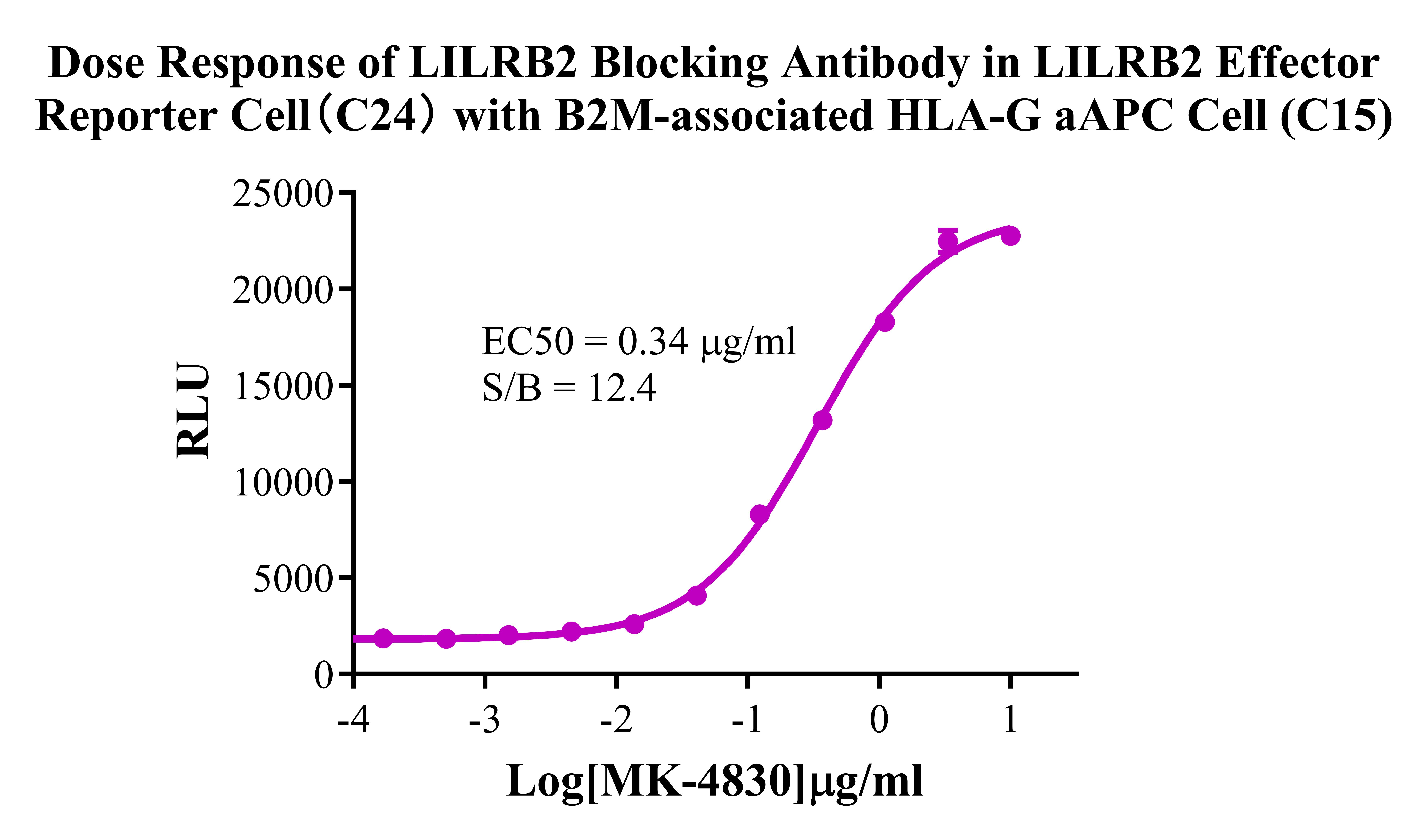 Figure 3.Dose Response of LILRB2 Blocking Antibody in LILRB2 Effector Reporter Cell (C24) with B2M-associated HLA-G/aAPC Cell(C15). |