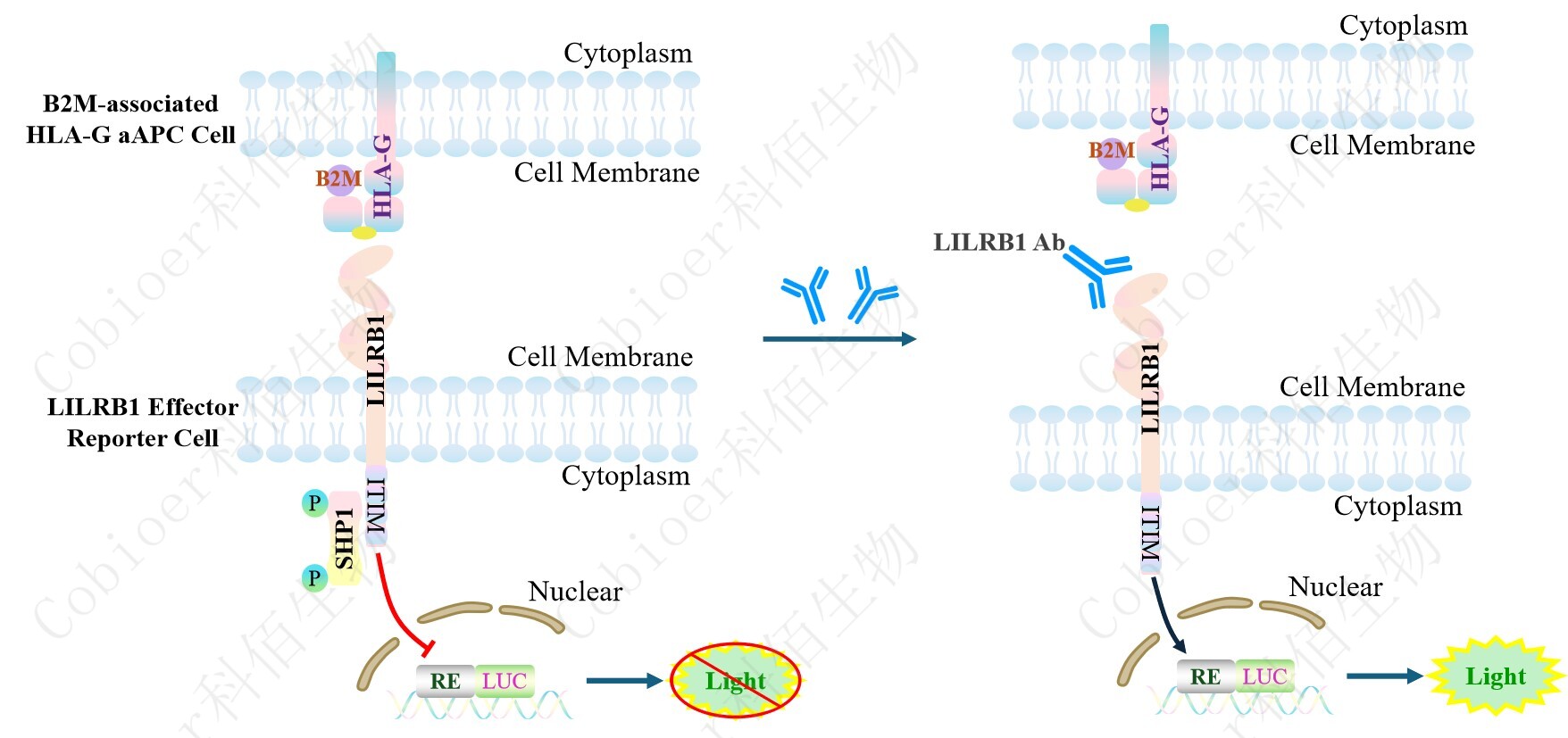 LILRB1 Effector Reporter Cell 報告基因藥靶模型很好的模擬了體內(nèi) LILRB1 的信號轉(zhuǎn)導過程,原理見下圖所示。![]() Figure 1. LILRB1 Effector Reporter Cell 模型原理圖 |