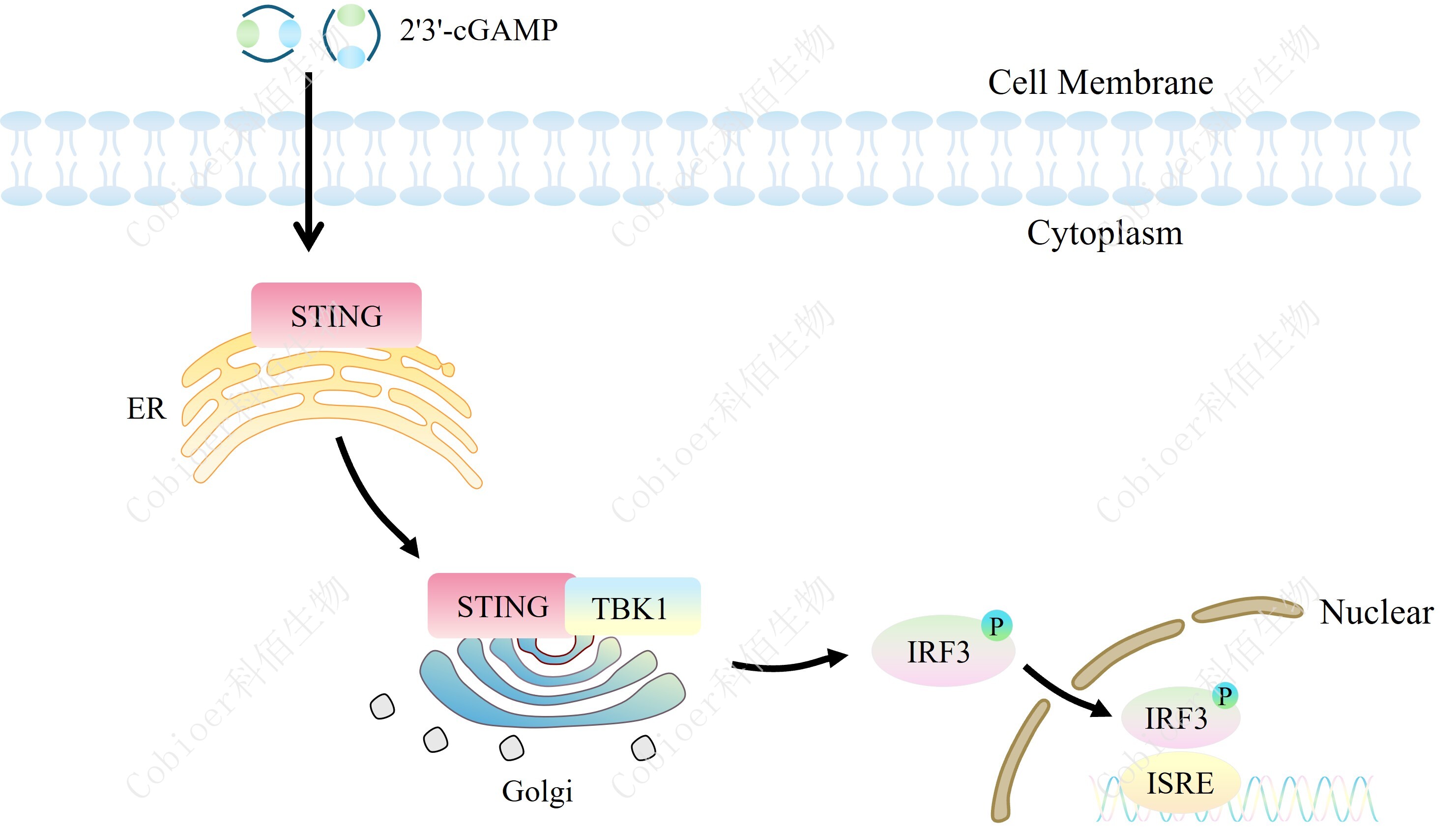ISRE-Luc RAW264.7 報(bào)告基因細(xì)胞,是由 ISRE 調(diào)控并表達(dá) Luc 熒光素 酶報(bào)告基因的 RAW264.7 細(xì)胞。RAW264.7 是小鼠巨噬細(xì)胞的常用模型,用于研究細(xì)胞對(duì) 微生物及其產(chǎn)物的反應(yīng)。RAW 264.7 衍生細(xì)胞內(nèi)源性表達(dá)許多 PRR,包括 toll 樣受體 (TLR)、NOD 樣受體 (NLR)、RIG-I 樣受體 (RLR) 和 C 型凝集素受體 (CLR)。 STING 激活的原理見下圖所示。