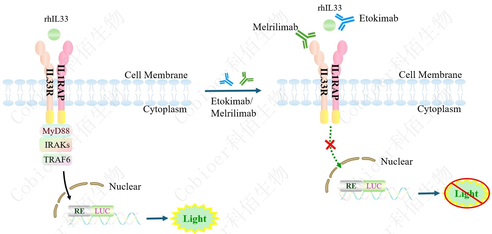 IL33 Effector Reporter Cell 報(bào)告基因藥靶模型很好的模擬了體內(nèi) IL33 的信號轉(zhuǎn)導(dǎo)過程, 原理見下圖所示。 Figure 1. IL33 Effector Reporter Cell 細(xì)胞模型原理圖 |