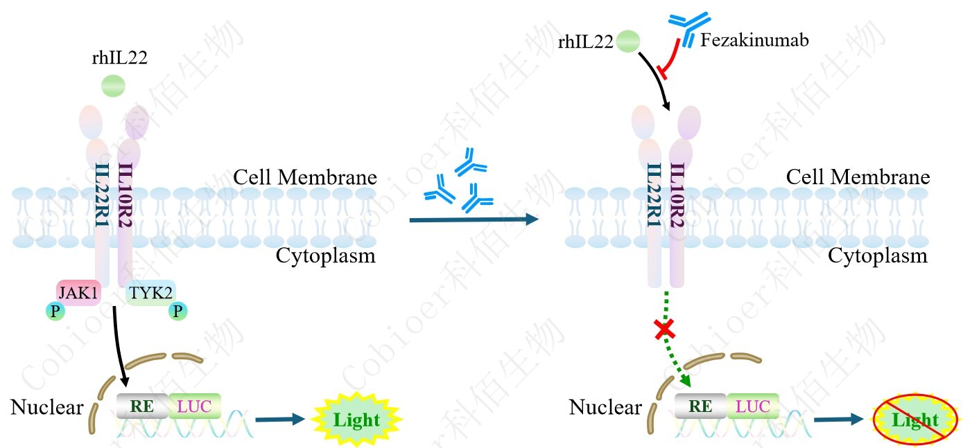 IL22 Effector Reporter Cell 報告基因藥靶模型很好的模擬了體內(nèi) IL22 的信號轉(zhuǎn)導過程, 原理見下圖所示。![]() Figure 1. IL22 Effector Reporter Cell 細胞模型原理圖 |