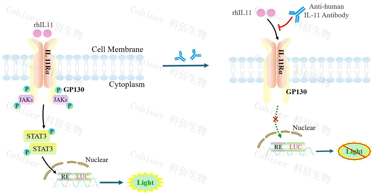 IL11 Effector Reporter Cell 報(bào)告基因藥靶模型很好的模擬了體內(nèi) IL11 的信號(hào)轉(zhuǎn)導(dǎo)過(guò)程, 原理見下圖所示。![]() Figure 1. IL11 Effector Reporter Cell 細(xì)胞模型原理圖 |
