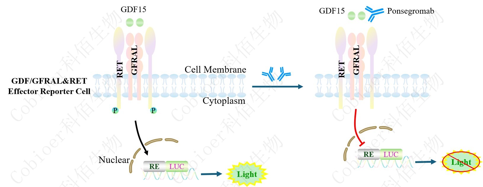 GDF/GFRAL&RET Effector Reporter Cell 報(bào)告基因藥靶模型很好的模擬了體內(nèi) GDF 的 信號(hào)轉(zhuǎn)導(dǎo)過(guò)程,原理見(jiàn)下圖所示。![]() Figure 1. GDF/GFRAL&RET Effector Reporter Cell 模型原理圖 |