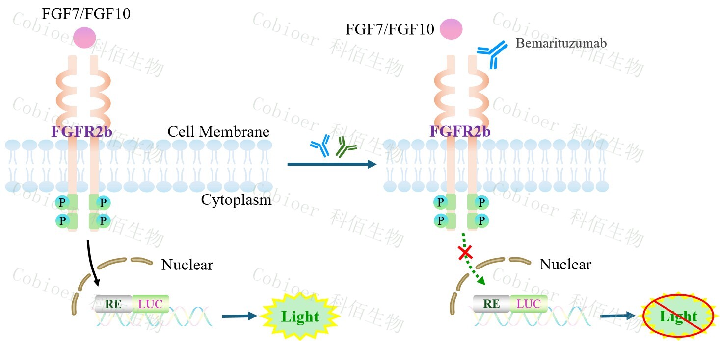 FGFR2b Effector Reporter Cell 報(bào)告基因藥靶模型很好的模擬了體內(nèi) FGFR2b 的信號轉(zhuǎn) 導(dǎo)過程,原理見圖 所示。![]() Figure 1. FGFR2b Effector Reporter Cell 細(xì)胞模型原理圖 |