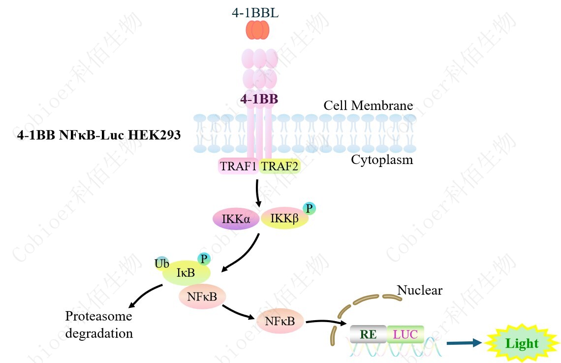 4-1BB NFκB-Luc HEK293 報告基因藥靶模型很好的模擬了體內(nèi) 4-1BB 的信號轉(zhuǎn)導(dǎo)過程, 原理見下圖所示。 Figure 1. 4-1BB NFκB-Luc HEK293 細胞模型原理圖
