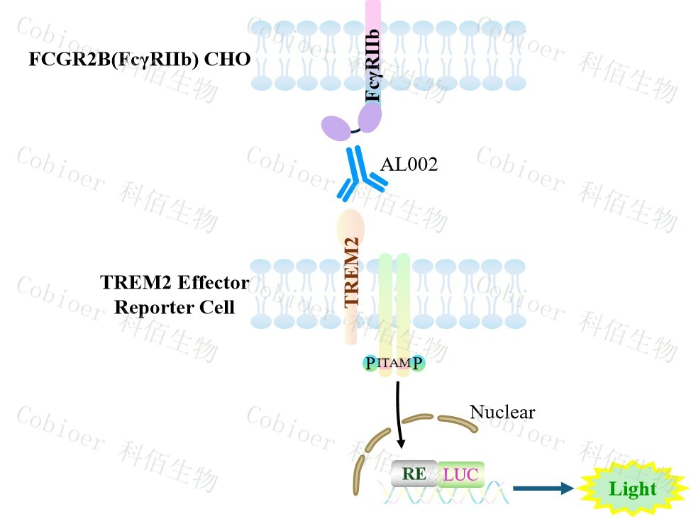 TREM2 Effector Reporter 報告基因藥靶模型很好的模擬了體內(nèi) TREM2 的信號轉(zhuǎn)導(dǎo)過程, 原理見下圖所示。