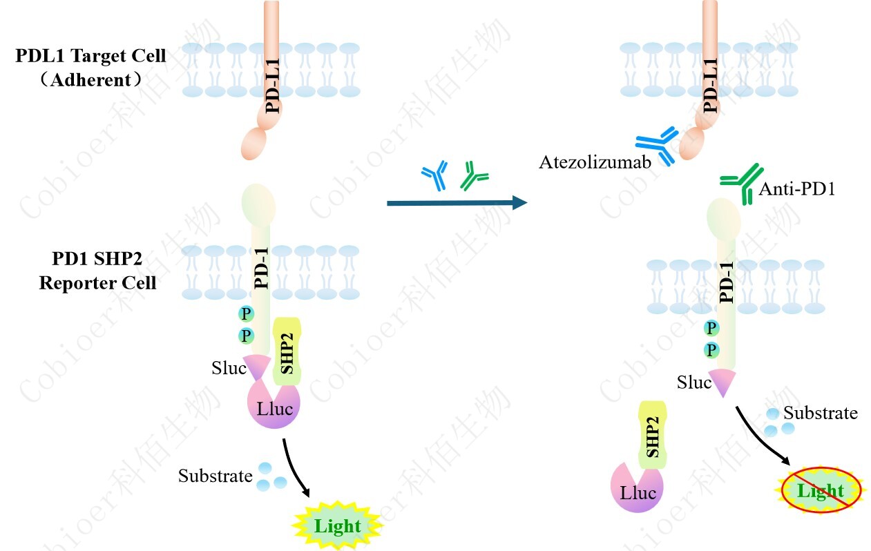 PDL1 Target Cell(Adherent)作為 PD1 SHP2 Reporter Cell 的靶細胞,藥靶模型很好的 模擬了體內(nèi) PD1&SHP2 的信號轉(zhuǎn)導(dǎo)過程,原理見下圖所示。![]() Figure 1. PDL1 Target Cell(Adherent)模型原理圖 |