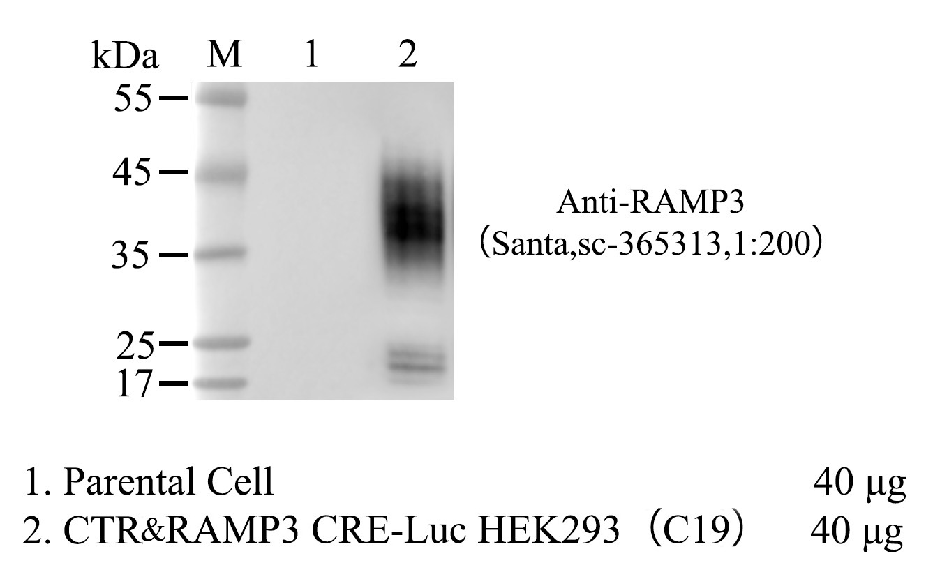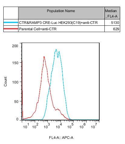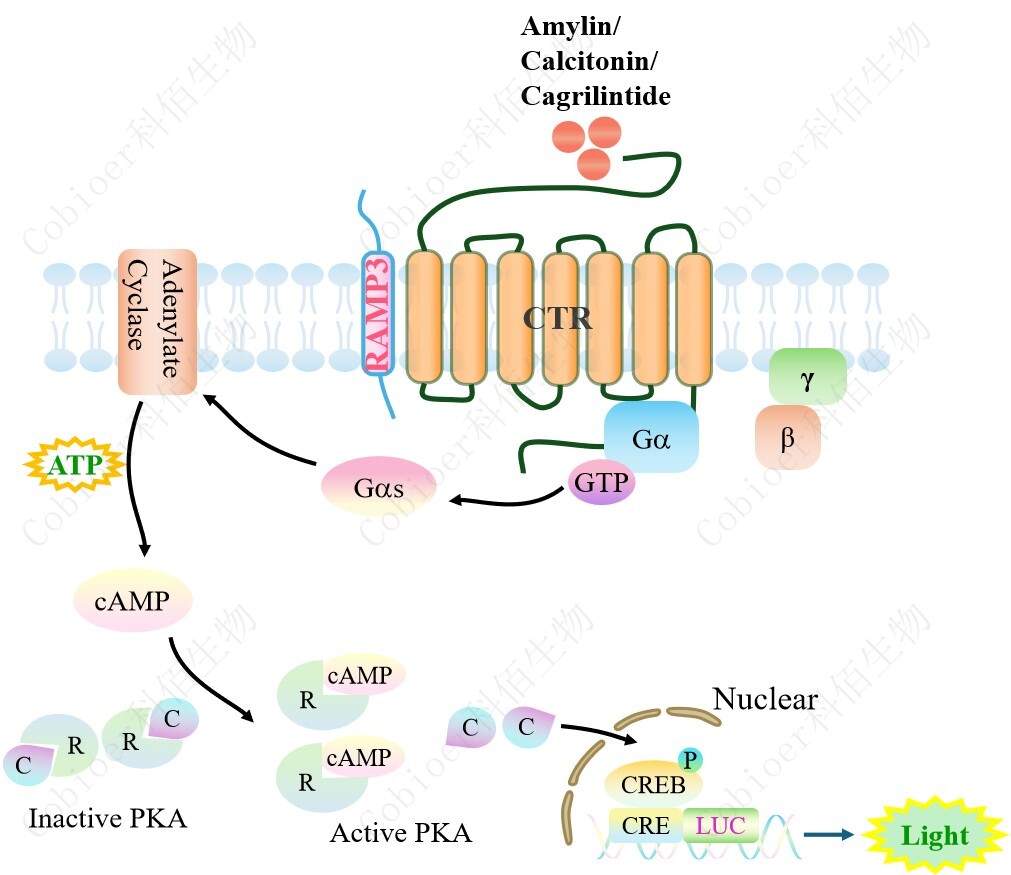 CTR&CTR&RAMP3 CRE-Luc HEK293 報告基因藥靶模型很好的模擬了體內(nèi) CTR 的信號轉(zhuǎn)導 過程,原理見下圖所示。![]() Figure 1. CTR&RAMP3 CRE-Luc HEK293 細胞模型原理圖 |