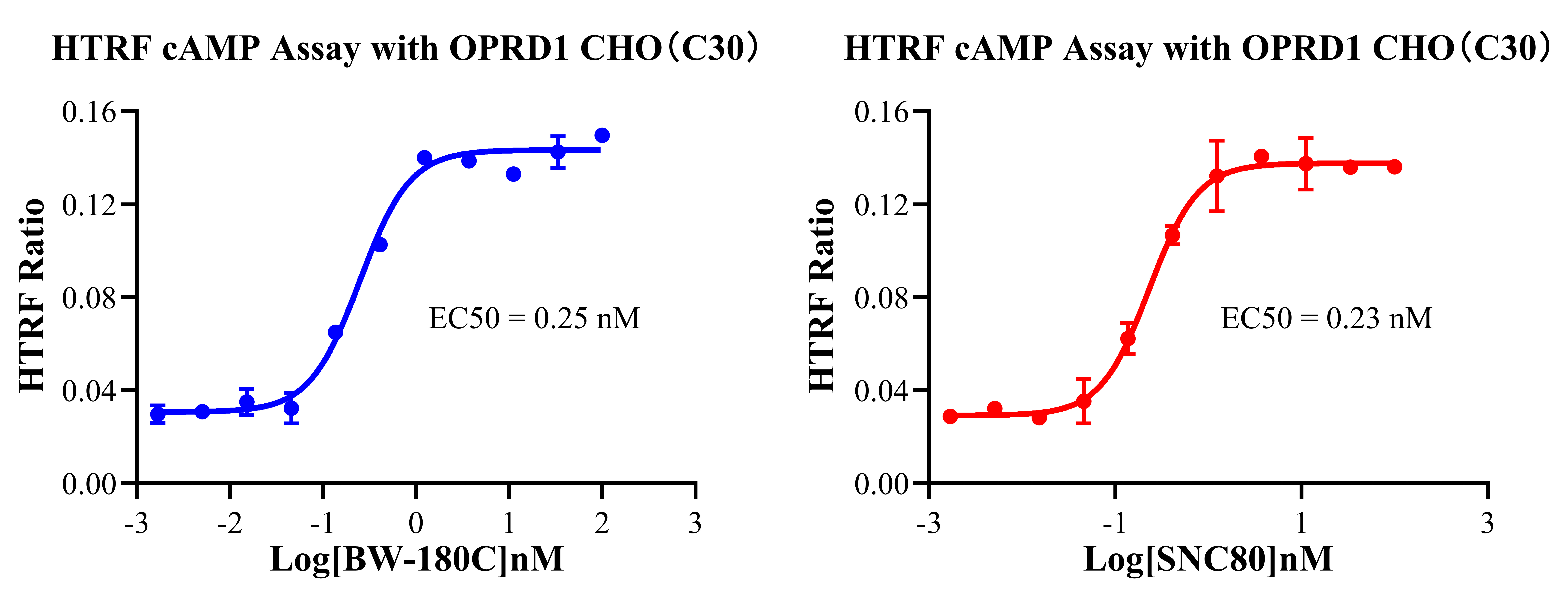 cAMP 在 G 蛋白偶聯(lián)受體(GPCR)信號轉(zhuǎn)導(dǎo)中是一種關(guān)鍵的第二信使。當(dāng)配體結(jié)合到 GPCR,構(gòu)象發(fā)生變化,激活受體接著激活 G 蛋白,Gi 的激活導(dǎo)致腺苷酸環(huán)化酶調(diào)控 cAMP 的下調(diào)。OPRD1 CHO 藥靶模型很好的模擬了體內(nèi) OPRD1 的信號轉(zhuǎn)導(dǎo)過程,原理見下圖所示。 |