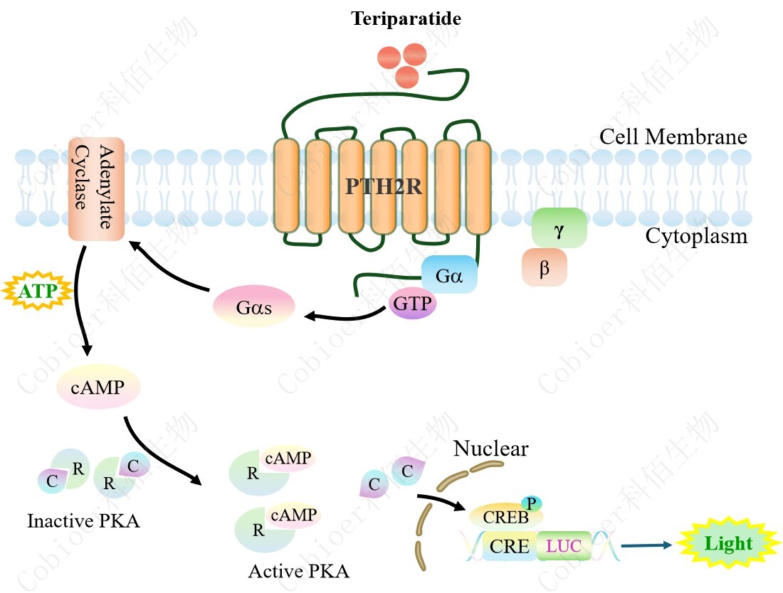 PTH2R CRE-Luc HEK293 報告基因藥靶模型很好的模擬了體內 PTH2R 的信號轉導過 程,原理見下圖所示。 ![]() Figure 1. PTH2R CRE-Luc HEK293 細胞模型原理圖 |