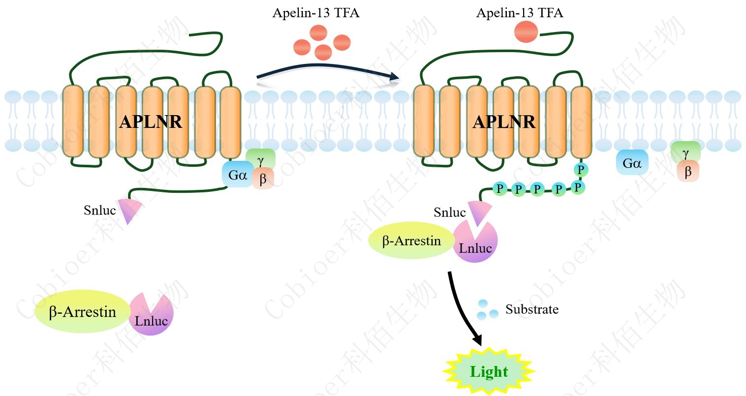 APLNR(APJ) β-Arrestin CHO 報告基因藥靶模型很好的模擬了體內(nèi) APLNR(APJ) /β-Arrestin 的信號轉(zhuǎn)導(dǎo)過程,原理見下圖所示。當(dāng)缺乏配體刺激時,β-Arrestin 不與 APLNR (APJ)結(jié)合,融合β-Arrestin 的熒光素酶處于失活構(gòu)象,當(dāng) APLNR(APJ)遭遇配體刺激 時,融合熒光素酶報告基因的β-Arrestin 被招募,使熒光素酶報告基因處于激活狀態(tài),加入 其底物后發(fā)光信號增強。![]() Figure 1. APLNR(APJ) β-Arrestin CHO 細(xì)胞模型原理圖 |