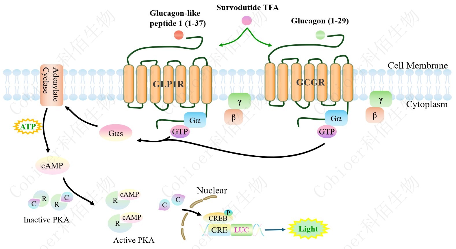 GLP1R&GCGR Dual Reporter Cell 報(bào)告基因藥靶模型很好的模擬了體內(nèi) GLP1R&GCGR 的信號(hào)轉(zhuǎn)導(dǎo)過程,原理見圖 1 所示。