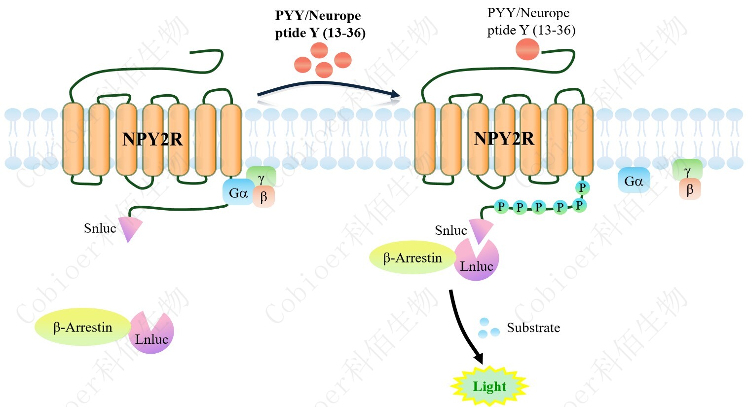 NPY2R β-Arrestin CHO 報告基因藥靶模型很好的模擬了體內 NPY2R/β-Arrestin 的信號 轉導過程,原理見下圖所示。當缺乏配體刺激時,β-Arrestin 不與 NPY2R 結合,融合β- Arrestin 的熒光素酶處于失活構象,當 NPY2R 遭遇配體刺激時,融合熒光素酶報告基因的β-Arrestin 被招募,使熒光素酶報告基因處于激活狀態(tài),加入其底物后發(fā)光信號增強。
