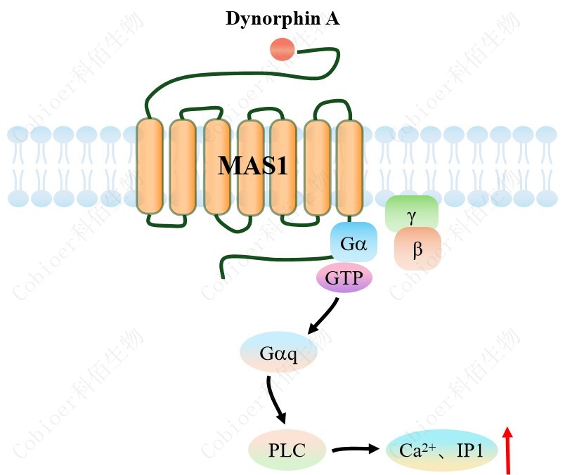 MAS1 可以通過 Gq 蛋白的信號通路,調(diào)控 IP1 的升高。MAS1 與配體結(jié)合,導(dǎo)致 Gαq 亞基的激活,觸發(fā) PLC-γ,從而產(chǎn)生兩個(gè)第二信使:IP3 和 DAG,它們參與細(xì)胞內(nèi)鈣動(dòng)員。 由于 IP3 在代謝上不穩(wěn)定,因此測量通路激活的替代標(biāo)志物 IP1 作為檢測標(biāo)準(zhǔn)。