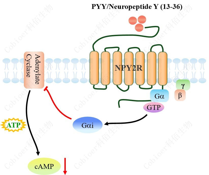 cAMP 在 G 蛋白偶聯(lián)受體(GPCR)信號轉(zhuǎn)導中是一種關鍵的第二信使。當配體結合 到 GPCR,構象發(fā)生變化,激活受體接著激活 G 蛋白,Gi 的激活導致腺苷酸環(huán)化酶調(diào)控 cAMP 的下調(diào)。NPY2R CHO 藥靶模型很好的模擬了體內(nèi) NPY2R 的信號轉(zhuǎn)導過程,原理見 下圖所示。