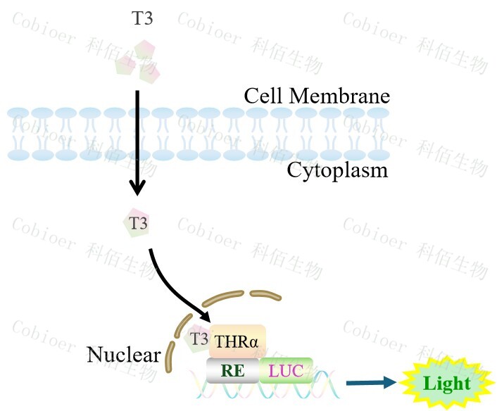 THRA Luciferase Reporter HEK293,是由 THRA 調(diào)控并表達 Luc 熒光素 酶報告基因的 HEK293 細胞。甲狀腺激素(T3/T4)是一種有效的甲狀腺激素,主要通過結(jié) 合 TRs 發(fā)揮作用,調(diào)控基因表達和細胞功能,原理見下圖所示。 ![]() Figure 1. THRA Luciferase Reporter HEK293 原理示意圖