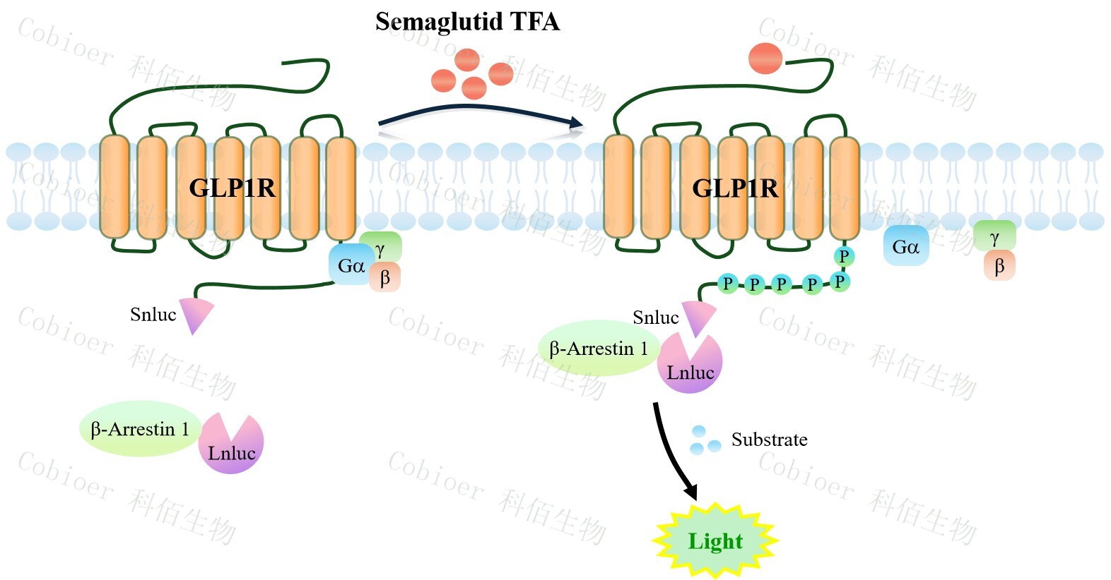 GLP1R β-Arrestin 1 CHO 報告基因藥靶模型很好的模擬了體內 GLP1R/β-Arrestin 1 的信 號轉導過程,原理見下圖所示。當缺乏配體刺激時,β-Arrestin 1 不與 GLP1R 結合,融合β- Arrestin 1 的熒光素酶處于失活構象,當 GLP1R 遭遇配體刺激時,融合熒光素酶報告基因 的β-Arrestin 1 被招募,使熒光素酶報告基因處于激活狀態(tài),加入其底物后發(fā)光信號增強。![]() Figure 1. GLP1R β-Arrestin 1 CHO 細胞模型原理圖 |