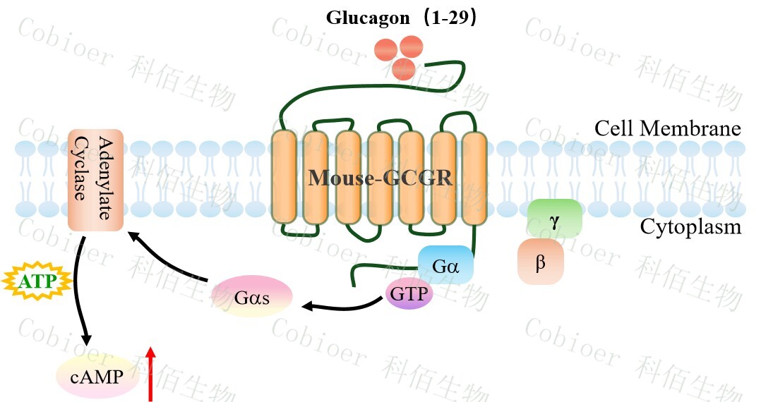 cAMP 在 G 蛋白偶聯(lián)受體(GPCR)信號(hào)轉(zhuǎn)導(dǎo)中是一種關(guān)鍵的第二信使。當(dāng)配體結(jié)合到 GPCR,構(gòu)象發(fā)生變化,激活受體接著激活 G 蛋白,Gs 的激活導(dǎo)致腺苷酸環(huán)化酶調(diào)控 cAMP 的升高。Mouse GCGR CHO 藥靶模型很好的模擬了體內(nèi) GCGR 的信號(hào)轉(zhuǎn)導(dǎo)過程,原理見下圖所示。![]() Figure 1.Mouse GCGR CHO 細(xì)胞模型原理圖