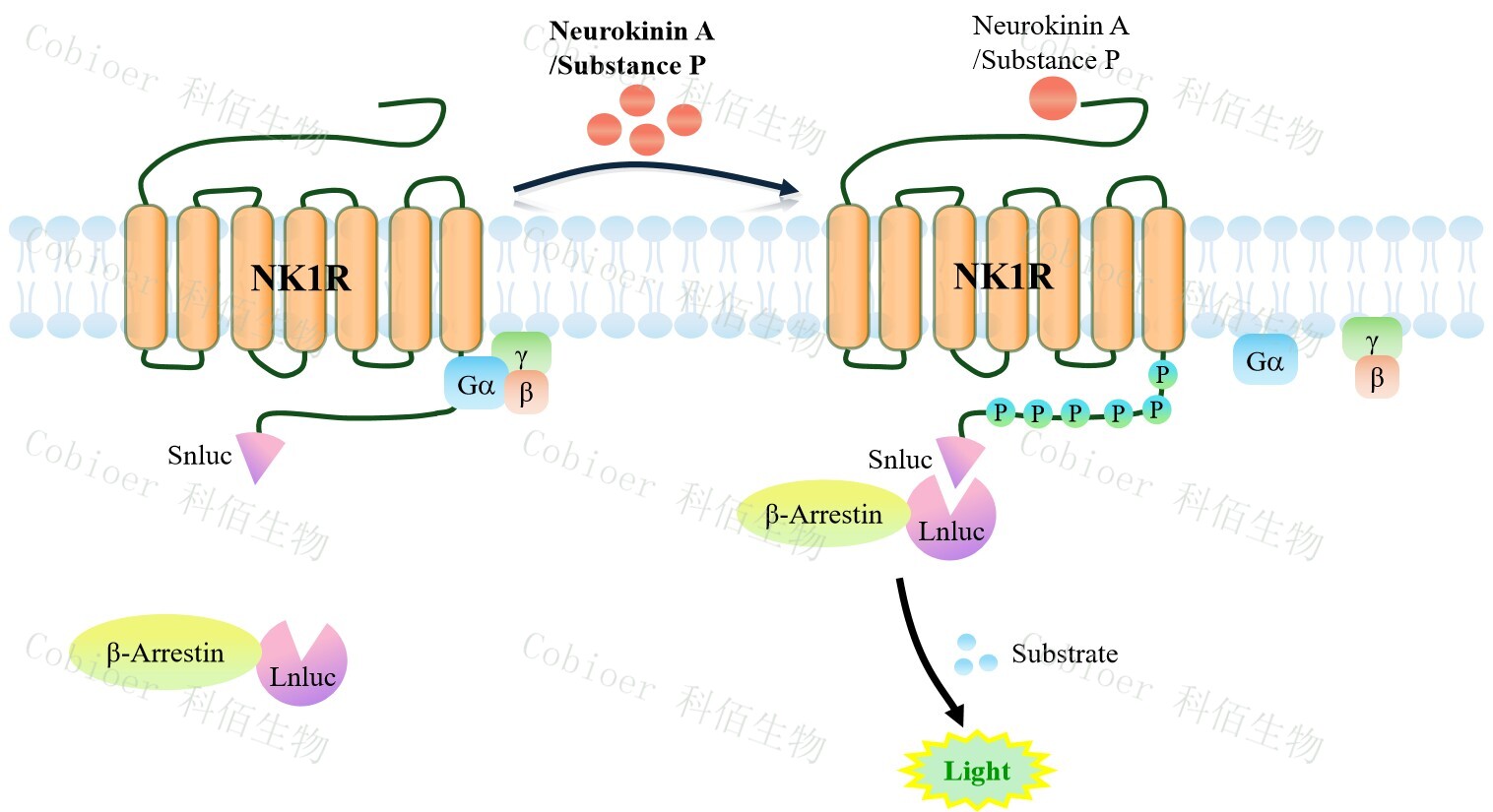 NK1R β-Arrestin CHO 報告基因藥靶模型很好的模擬了體內(nèi) NK1R/β-Arrestin 的信號轉(zhuǎn) 導(dǎo)過程,原理見下圖所示。當(dāng)缺乏配體刺激時,β-Arrestin 不與 NK1R 結(jié)合,融合β-Arrestin的熒光素酶處于失活構(gòu)象,當(dāng) NK1R 遭遇配體刺激時,融合熒光素酶報告基因的β-Arrestin 被招募,使熒光素酶報告基因處于激活狀態(tài),加入其底物后發(fā)光信號增強。![]() Figure 1. NK1R β-Arrestin CHO 細(xì)胞模型原理圖 |