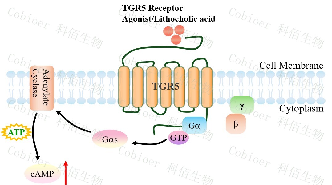 | TGR5 受體是第一個已知的膽汁酸特異性 G 蛋白偶聯(lián)受體,也被稱為膽汁酸受體 1(GPBAR1),屬于 A 類 GPCR 亞家族。該受體由七個跨膜螺旋(TMH1-7)、三個胞外環(huán) (ECL1-3)組成,有助于配體結(jié)合,以及三個胞內(nèi)環(huán)(ICL1-3),參與將信號傳遞給下游 信號分子。TGR5 在體內(nèi)廣泛存在,在膽囊、回腸、結(jié)腸、棕色脂肪組織、脾臟、肺、骨 骼肌、胰島,肝臟中均有表達(dá)。有文獻報道 TGR5 被認(rèn)為是治療代謝性疾?。ㄈ?2 型糖尿 病)的潛在靶點。此外,TGR5 還能降低單核細(xì)胞中促炎細(xì)胞因子的水平,在炎癥過程 (包括結(jié)腸炎和動脈粥樣硬化)中發(fā)揮核心作用的病理調(diào)節(jié)。 | |