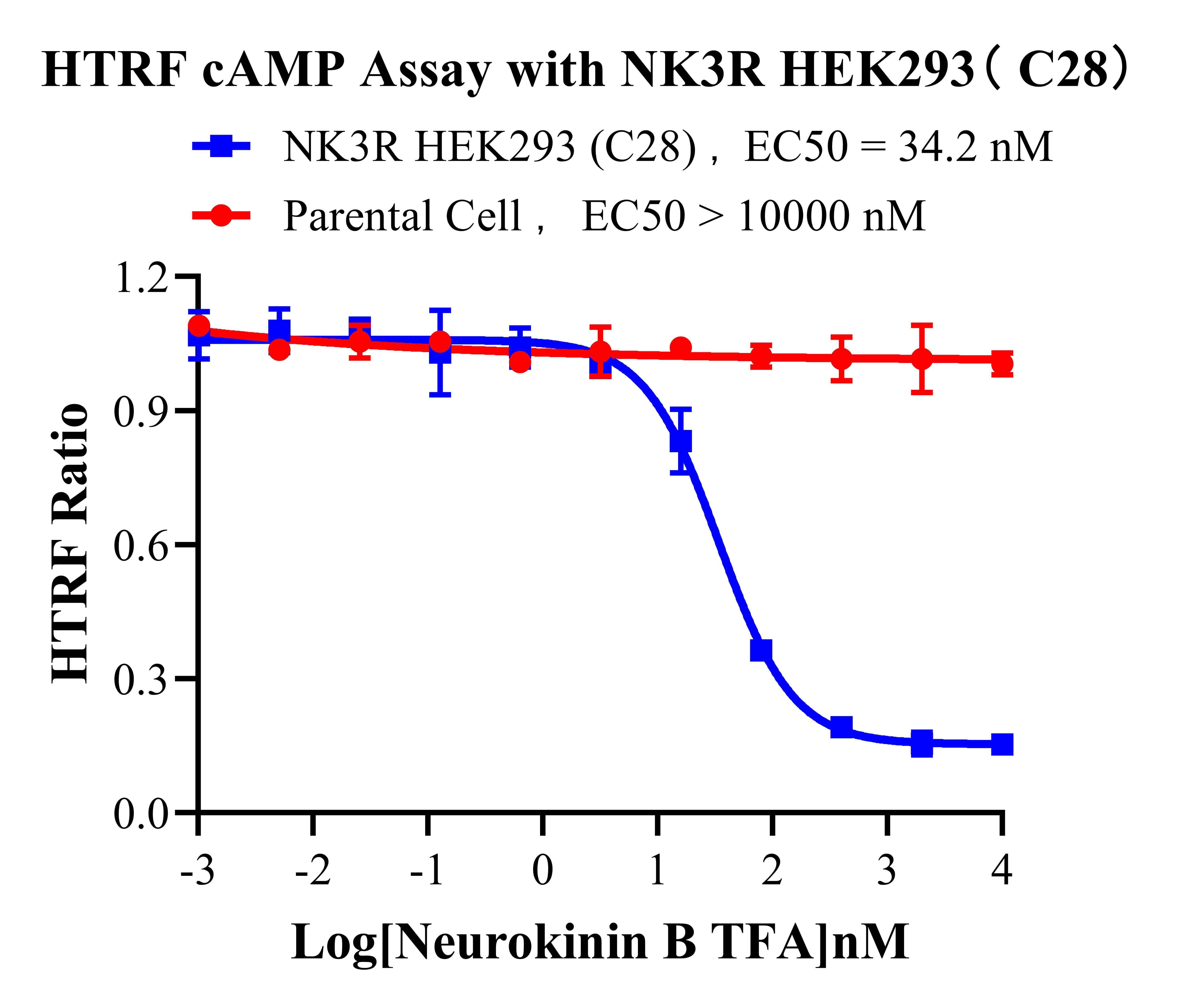 cAMP 在 G 蛋白偶聯(lián)受體(GPCR)信號(hào)轉(zhuǎn)導(dǎo)中是一種關(guān)鍵的第二信使。當(dāng)配體結(jié)合 到 GPCR,構(gòu)象發(fā)生變化,激活受體接著激活 G 蛋白,Gs 的激活導(dǎo)致腺苷酸環(huán)化酶調(diào)控 cAMP 的升高。NK3R HEK293 細(xì)胞藥靶模型很好的模擬了體內(nèi) NK3R 的信號(hào)轉(zhuǎn)導(dǎo)過程,原 理見下圖所示。