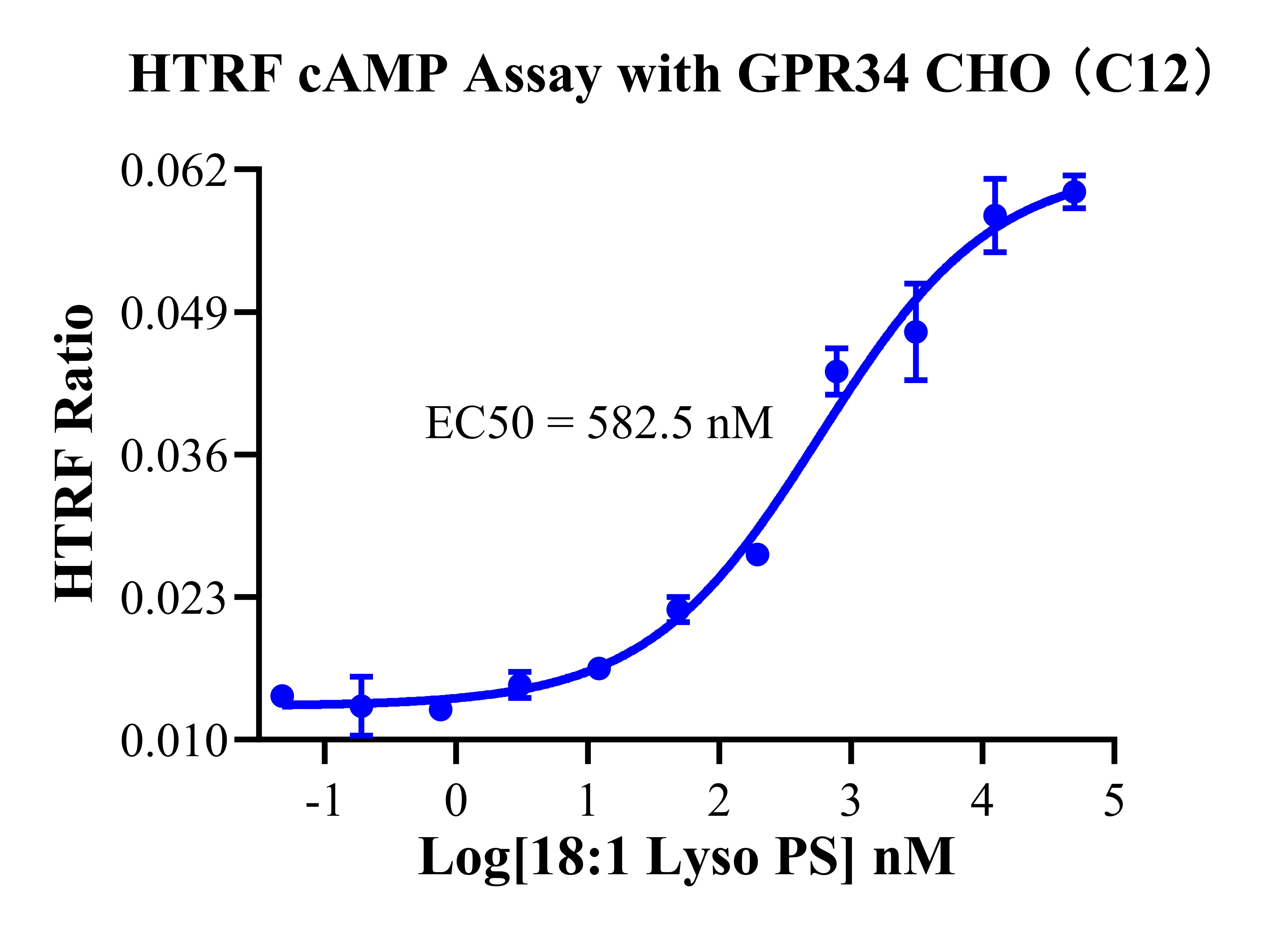 cAMP 在 G 蛋白偶聯(lián)受體(GPCR)信號(hào)轉(zhuǎn)導(dǎo)中是一種關(guān)鍵的第二信使。當(dāng)配體結(jié)合 到 GPCR,構(gòu)象發(fā)生變化,激活受體接著激活 G 蛋白,Gi 的激活導(dǎo)致腺苷酸環(huán)化酶調(diào)控 cAMP 的下調(diào)。GPR34 CHO 藥靶模型很好的模擬了體內(nèi) GPR34 的信號(hào)轉(zhuǎn)導(dǎo)過(guò)程,原理見(jiàn)下圖所示。![]() Figure 1. GPR34 CHO 細(xì)胞模型原理圖 |