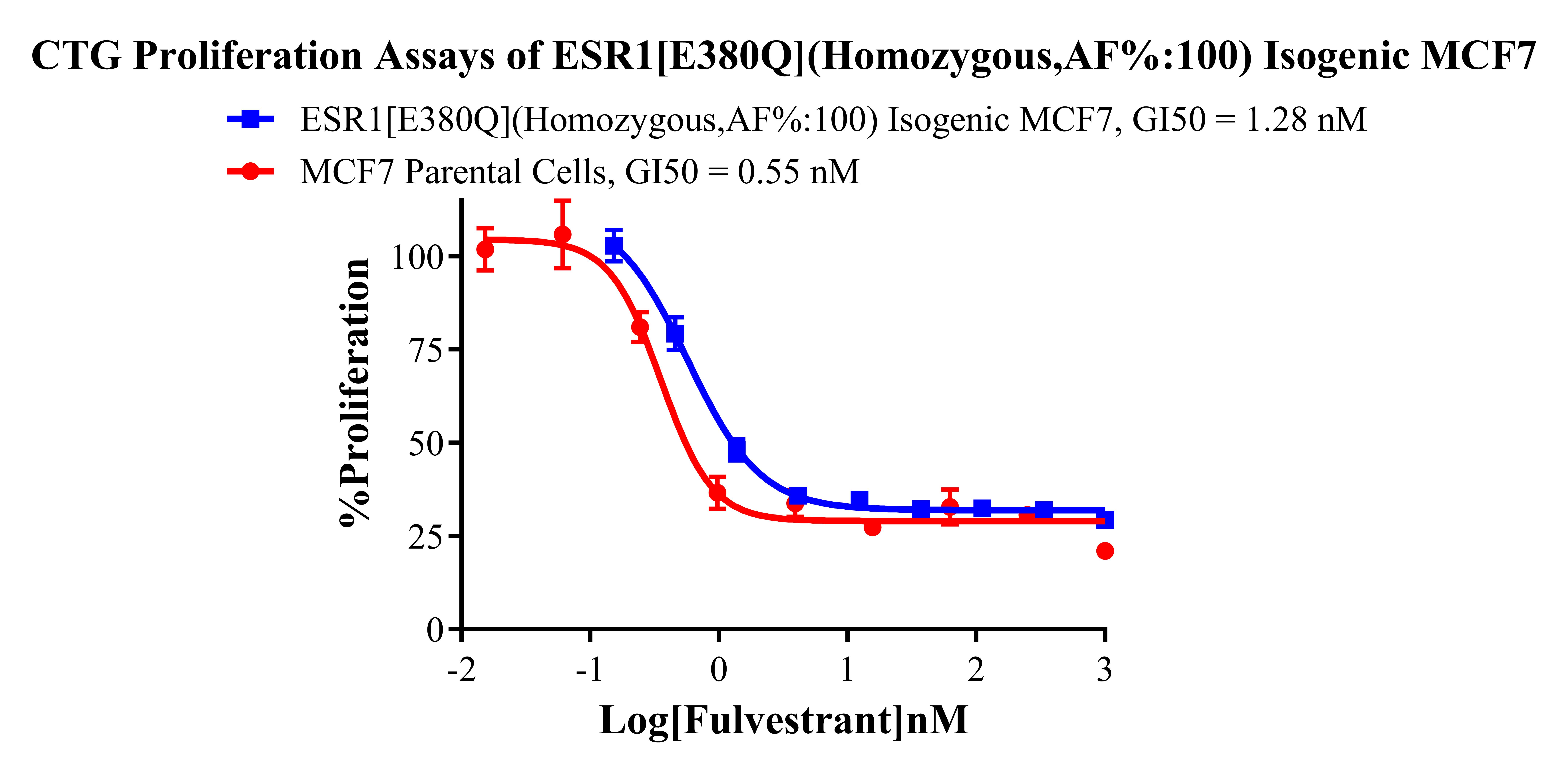 ![]() Figure 1. A: MCF7 Parental Cell;B:ESR1[E380Q] (Homozygous,AF%:100) Isogenic MCF7 通道2 藍色微滴代表ESR1[E380Q]突變陽性,通道2 綠色微滴代表該位點為陰性野生型 ![]() Figure 2. CTG Proliferation Assays of ESR1[E380Q](Homozygous,AF%:100) Isogenie MCF7. |