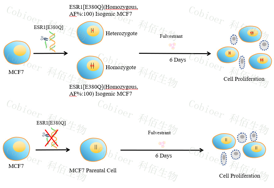 ESR1[E380Q](Homozygous,AF%:100) Isogenic MCF7 藥靶細胞,通過基因編輯的方式將 ESR1 的 380 位氨基酸谷氨酸(E)突變?yōu)楣劝滨0罚≦)。![]() 圖 1: ESR1[E380Q](Homozygous,AF%:100) Isogenic MCF7 細胞的構建原理圖