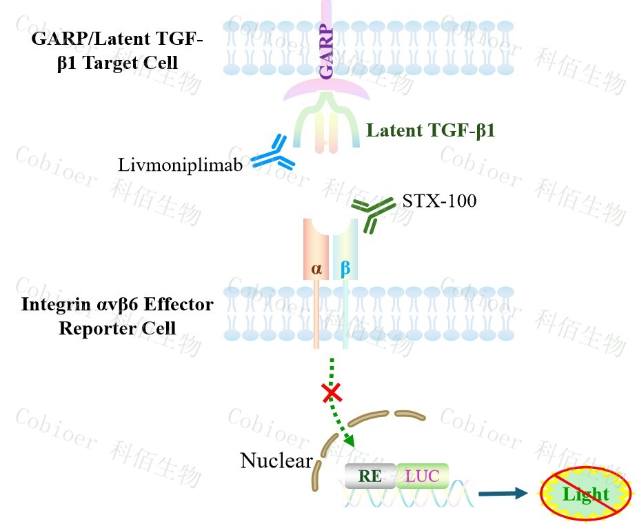 GARP/Latent TGF-β1 Target Cell 作為 Integrin αvβ6 Effector Reporter Cell 的靶細(xì)胞,藥 靶模型很好的模擬了體內(nèi) Integrin&GARP/Latent TGF-β1 的信號(hào)轉(zhuǎn)導(dǎo)過程,原理見下圖所示。![]() Figure 1. GARP/Latent TGF-β1 Target Cell 細(xì)胞模型圖 |