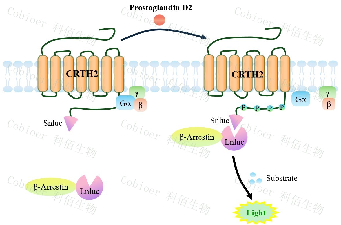 CRTH2(DP2) β-Arrestin CHO 報(bào)告基因藥靶模型很好的模擬了體內(nèi) CRTH2(DP2)/β- Arrestin 的信號(hào)轉(zhuǎn)導(dǎo)過程, 原理見下圖所示。 當(dāng)缺乏配體刺激時(shí) , β-Arrestin 不與 CRTH2(DP2)結(jié)合,融合β-Arrestin 的熒光素酶處于失活構(gòu)象,當(dāng) CRTH2(DP2)遭遇配體刺 激時(shí),融合熒光素酶報(bào)告基因的β-Arrestin 被招募,使熒光素酶報(bào)告基因處于激活狀態(tài),加 入其底物后發(fā)光信號(hào)增強(qiáng)。![]() Figure 1. CRTH2(DP2) β-Arrestin CHO 細(xì)胞模型原理圖 |