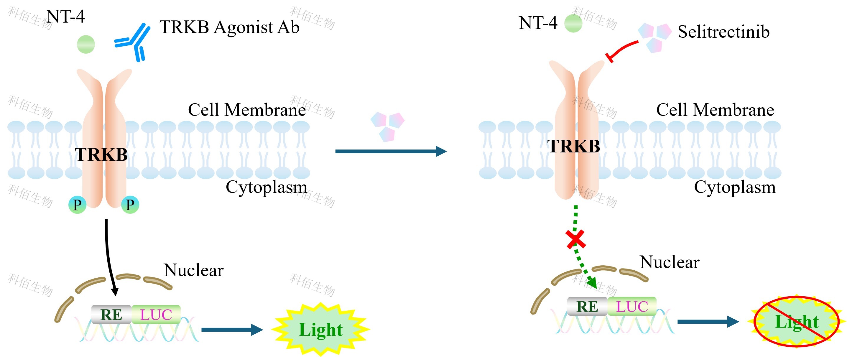 TRKB Effector Reporter Cell 報(bào)告基因藥靶模型很好的模擬了體內(nèi) TRKB 的信號轉(zhuǎn)導(dǎo)過程,原理見下圖所示。![]() Figure 1. TRKB Effector Reporter Cell 模型原理圖 |
