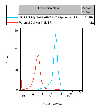 NMBR(BB1) Gα15 HEK293 細(xì)胞藥靶模型很好的模擬了體內(nèi) NMBR(BB1)&Gα15 的信號轉(zhuǎn)導(dǎo)過程,原理見下圖所示。![]() Figure 1. NMBR(BB1) Gα15 HEK293 細(xì)胞模型原理圖 |