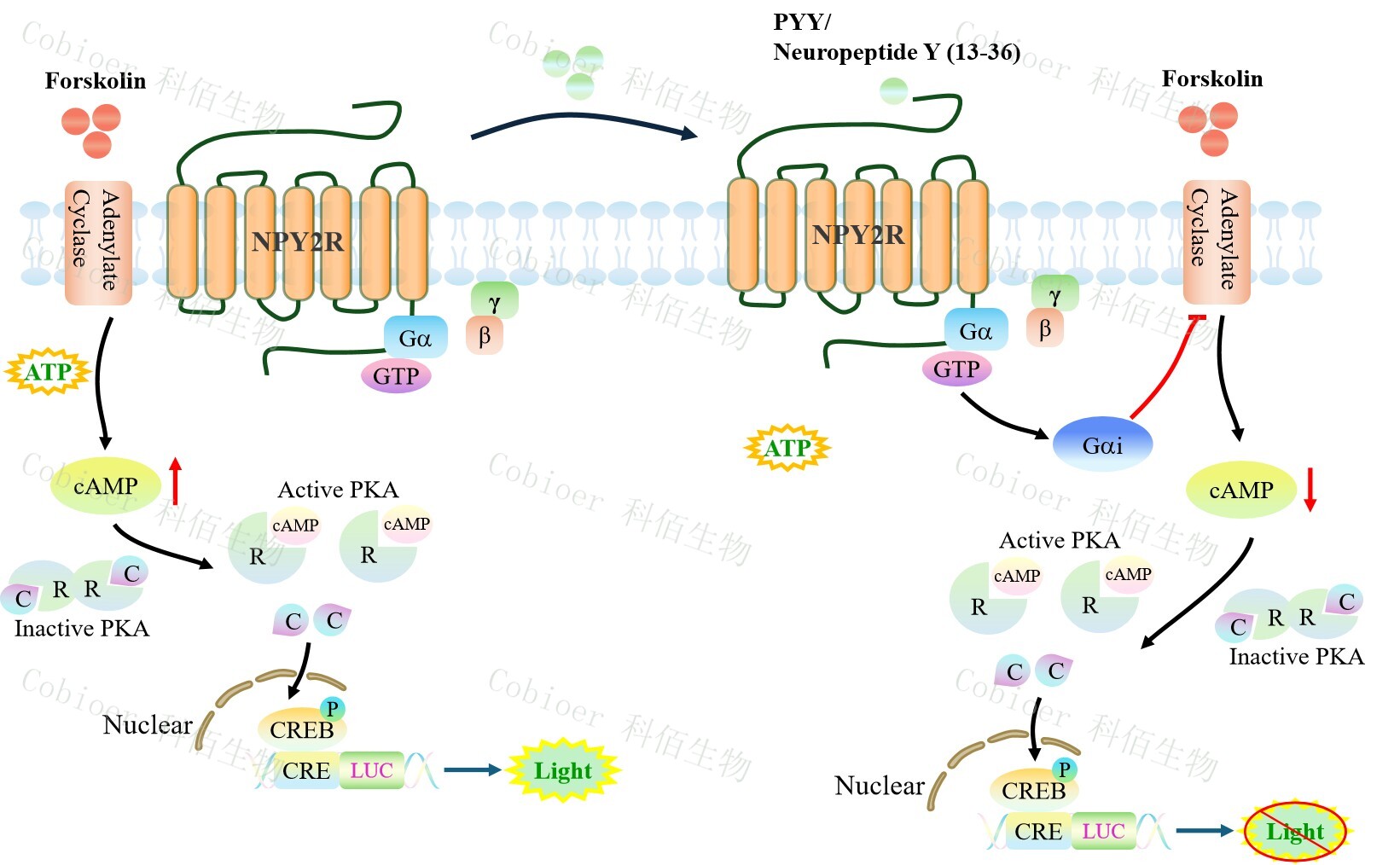 NPY2R CRE-Luc CHO 藥靶模型很好的模擬了體內(nèi) NPY2R 的信號(hào)轉(zhuǎn)導(dǎo)過(guò)程,原理見(jiàn)下圖所示。![]() Figure 1. NPY2R CRE-Luc CHO 細(xì)胞模型原理圖 |