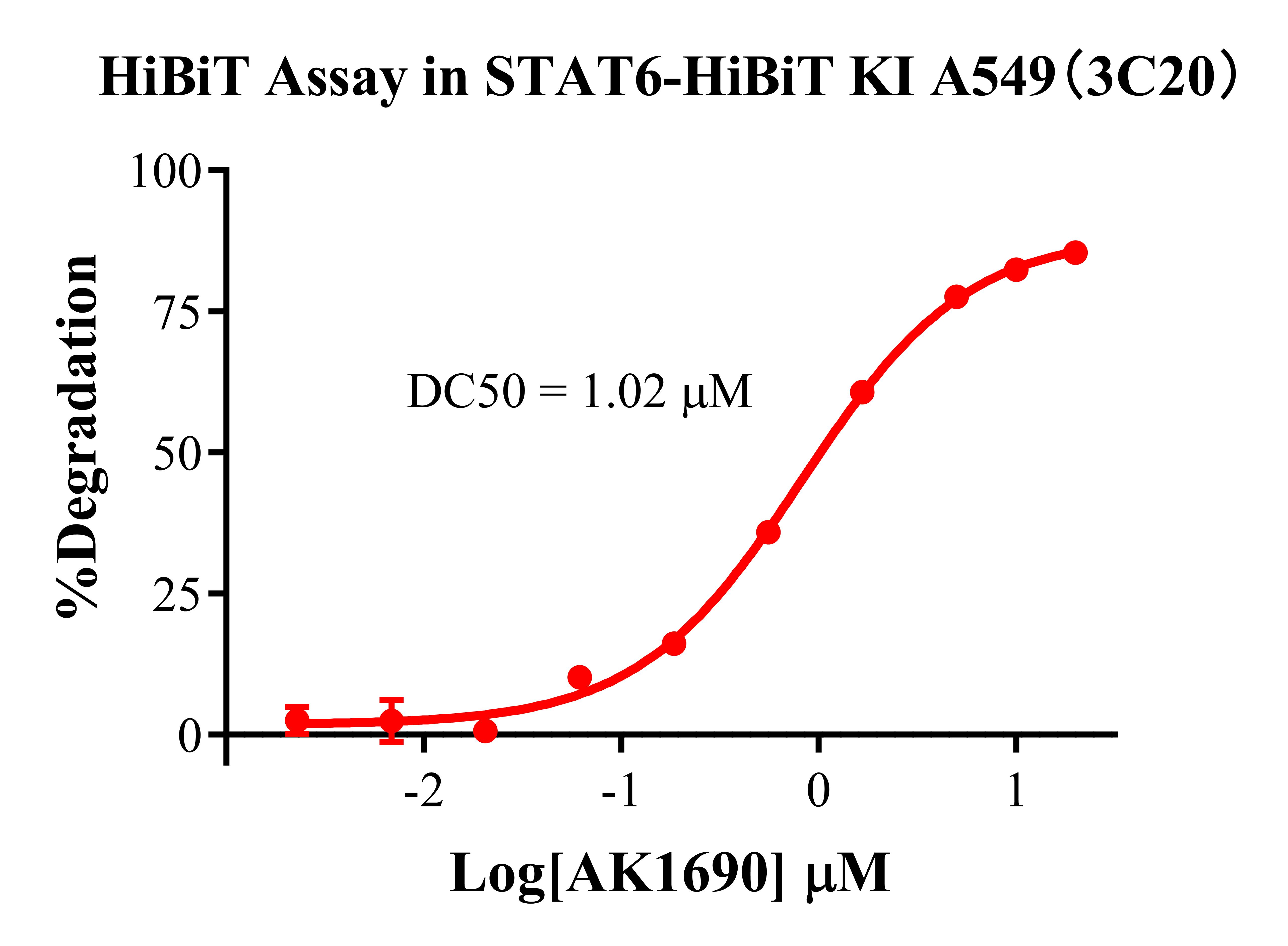 STAT6-HiBiT KI A549 報告基因細胞,通過基因編輯方式將 HiBiT 標簽 插入細胞內(nèi)源的 STAT6 基因中。AK-1690 是一種有效和選擇性的 STAT6 PROTAC 降解劑, 原理見下圖所示。![]() Figure 1. STAT6-HiBiT KI A549 細胞模型原理圖 |