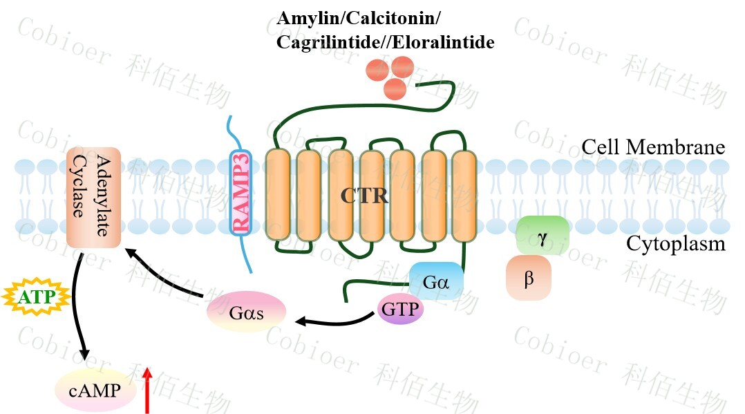 | 降鈣素基因相關(guān)肽(CGRP)家族包括 CGRP 本身、降鈣素(CT)、腎上腺髓質(zhì)素 (AM)和胰島淀粉樣肽(AMY)。 胰淀素(Amylin)受體的三種類型的已被確定,即 AMY1,AMY2 和 AMY3。胰淀素 受體屬于 B 類 GPCR,是異二聚體復(fù)合物,由降鈣素受體(CTR)與受體活性修飾蛋白 (RAMPs)結(jié)合形成。該受體的 CTR 組分具有相同的 GPCR 結(jié)構(gòu):7 個跨膜相互連接的α- 螺旋,將細(xì)胞外信號傳遞到細(xì)胞內(nèi)細(xì)胞質(zhì)信號級聯(lián)。RAMP 有三種類型(RAMP1、 RAMP2 和 RAMP3),它們共享 31%的氨基酸序列,具有相似的基本結(jié)構(gòu)。RAMP 是將 CTR 轉(zhuǎn)運(yùn)到細(xì)胞膜并調(diào)節(jié)其配體特異性的重要肽,它可以改變特定 GPCR 的藥理學(xué)、功能 和細(xì)胞運(yùn)輸。 哺乳動物細(xì)胞中 Amylin 受體的激活已被證明可以提高 cAMP,并被認(rèn)為與 Gs 蛋白和 腺苷酸環(huán)化酶的刺激有關(guān)。在 RAMPs 的存在下,其與胰淀素的結(jié)合親和力可以被修飾。 CTR 和 RAMP1 或 CTR 和 RAMP3 的異質(zhì)結(jié)構(gòu)被認(rèn)為有利于與胰淀素結(jié)合,介導(dǎo)大腦中的 生理功能。AMY3 的激活刺激 G 蛋白 Gαs,進(jìn)一步控制腺苷酸環(huán)化酶(AC),隨后增加細(xì) 胞 cAMP。cAMP 與 PKA 調(diào)控亞基(R2)的結(jié)合誘導(dǎo) PKA 四聚體全酶解離,導(dǎo)致 PKA 催 化亞基的激活。cAMP 激活的 PKA 參與調(diào)控 ERK1/2 的活性。ERK1/2 通路的觸發(fā)可能導(dǎo)致 Ca 2+分布不均勻,引發(fā)內(nèi)質(zhì)網(wǎng)和線粒體功能障礙,導(dǎo)致細(xì)胞死亡。此外,cAMP 刺激 AKT 進(jìn)一步導(dǎo)致轉(zhuǎn)錄因子 cFos 的表達(dá)。 |