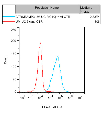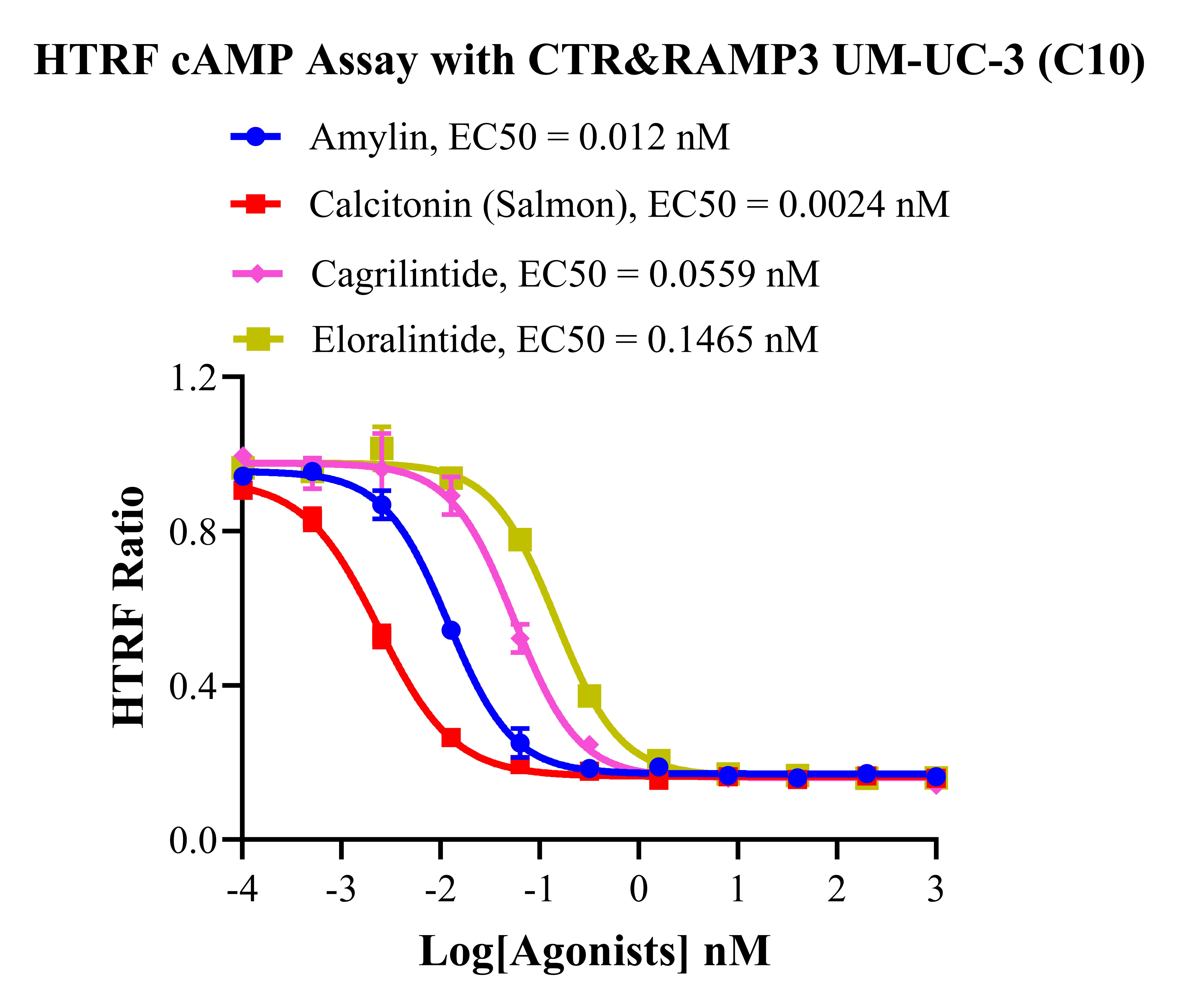 CTR&RAMP3 UM-UC-3 細(xì)胞藥靶模型很好的模擬了體內(nèi) CTR&RAMP3 的信號轉(zhuǎn)導(dǎo)過程,原理見下圖所示。![]() Figure 1. CTR&RAMP3 UM-UC-3 細(xì)胞模型原理圖 |