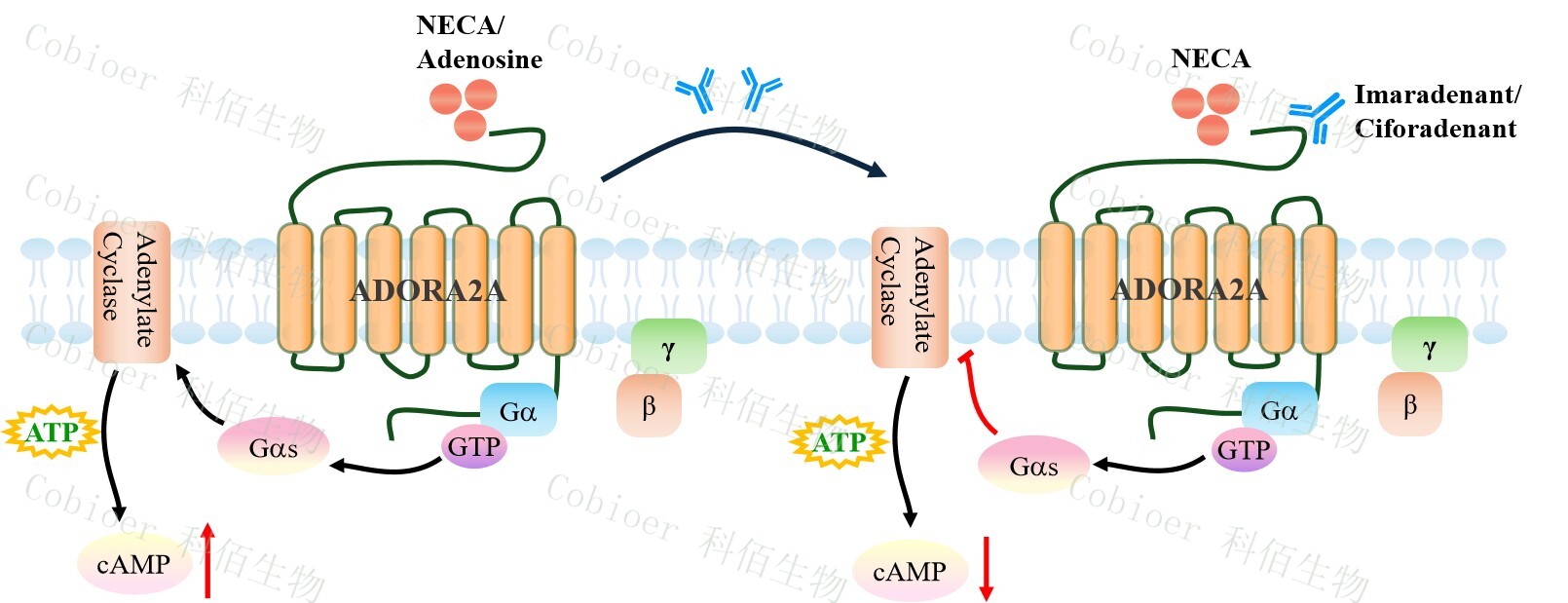 cAMP 在 G 蛋白偶聯(lián)受體(GPCR)信號(hào)轉(zhuǎn)導(dǎo)中是一種關(guān)鍵的第二信使。當(dāng)配體結(jié)合 到 GPCR,構(gòu)象發(fā)生變化,激活受體接著激活 G 蛋白,Gs 的激活導(dǎo)致腺苷酸環(huán)化酶調(diào)控 cAMP 的升高。