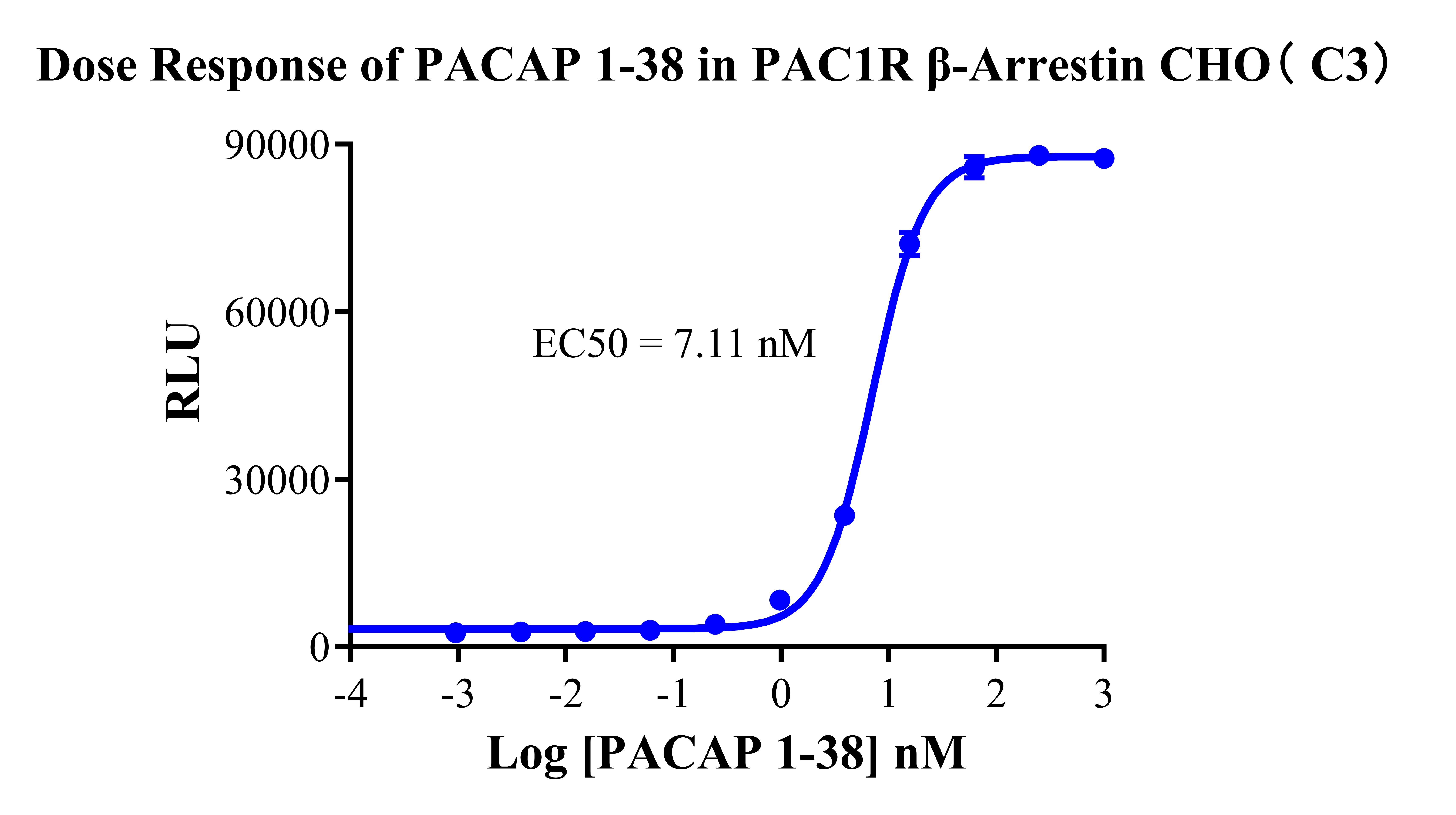 PAC1R β-Arrestin CHO 報告基因藥靶模型很好的模擬了體內(nèi) PAC1R/β-Arrestin 的信號轉(zhuǎn)導過程,原理見下圖所示。當缺乏配體刺激時,β-Arrestin 不與 PAC1R 結合,融合β- Arrestin 的熒光素酶處于失活構象,當 PAC1R 遭遇配體刺激時,融合熒光素酶報告基因的 β-Arrestin 被招募,使熒光素酶報告基因處于激活狀態(tài),加入其底物后發(fā)光信號增強。![]() Figure 1. PAC1R β-Arrestin CHO 細胞模型原理圖 |