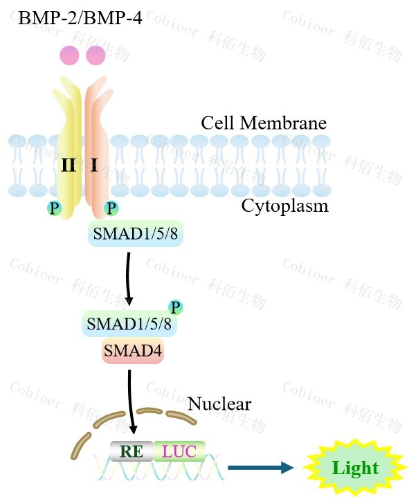 BMP Effector Reporter Cell 報(bào)告基因藥靶模型很好的模擬了體內(nèi) BMP 的信號(hào)轉(zhuǎn)導(dǎo)過(guò)程, 原理見(jiàn)下圖所示。![]() Figure 1. BMP Effector Reporter Cell 細(xì)胞模型原理圖 |