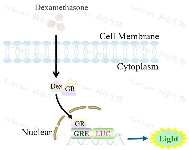 GRE-Luc HEK293 報告基因細胞,是由 GRE 調控并表達 Luc 熒光素酶 報告基因的 HEK293 細胞。Dexamethasone (Hexadecadrol,地塞米松)是糖皮質激素受體 (Glucocorticoid Receptor)激動劑、凋亡誘導劑,原理見下圖所示。![]() Figure 1. GRE-Luc HEK293 細胞原理示意圖 |